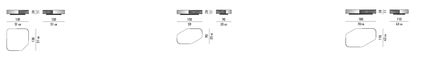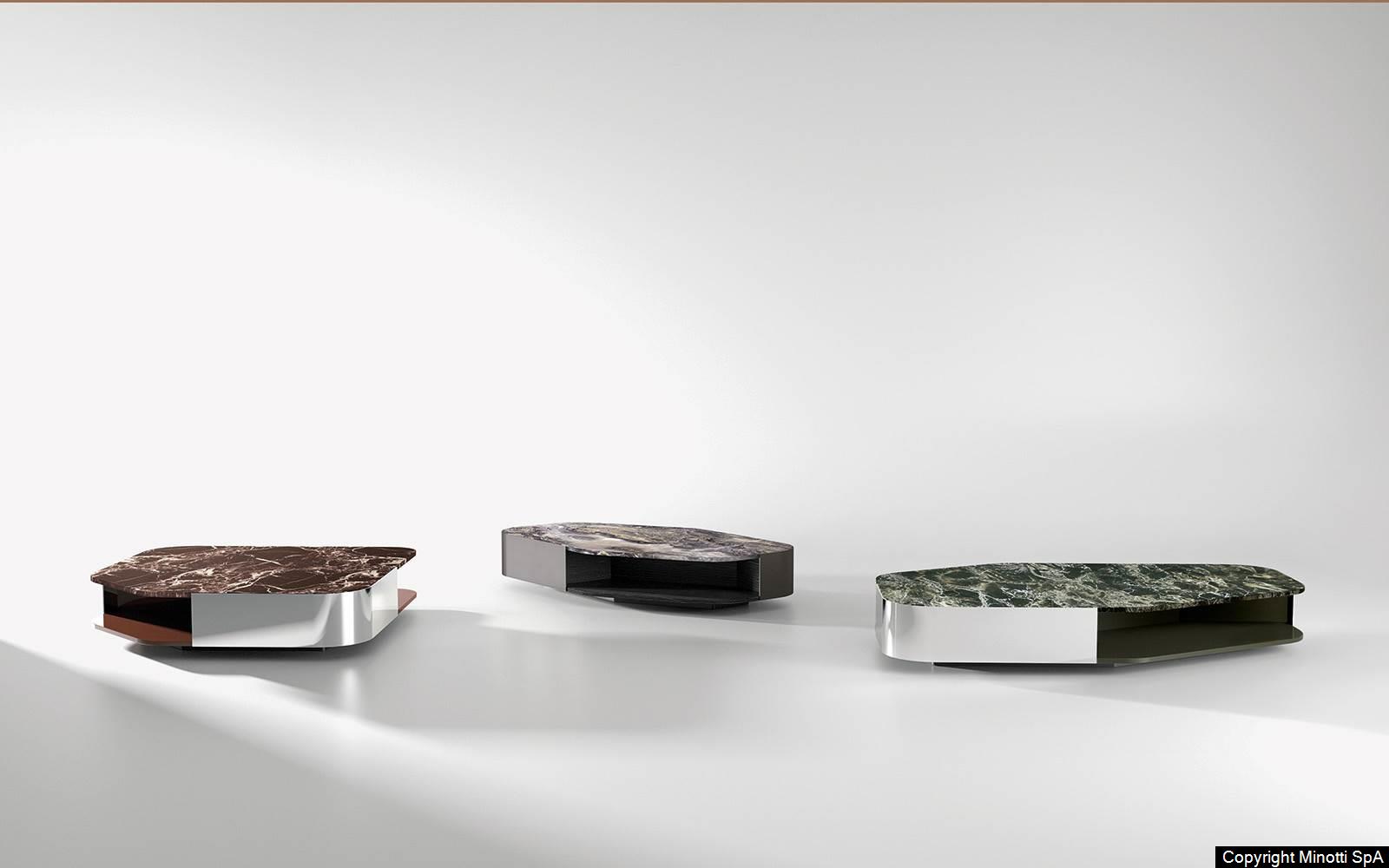 Семейство журнальных столиков Diagramma вдохновлено графическими линиями, которые придают им уникальную динамику и универсальность. Неправильная форма и многогранные элементы создают эффект объемной скульптуры, способной стать центром внимания в любом пространстве. Металлическая лента, обрамляющая верхнюю и нижнюю столешницы, прерывается, образуя стильные отсеки для хранения — это сочетание твердых поверхностей и воздушных пустот делает дизайн по-настоящему запоминающимся.