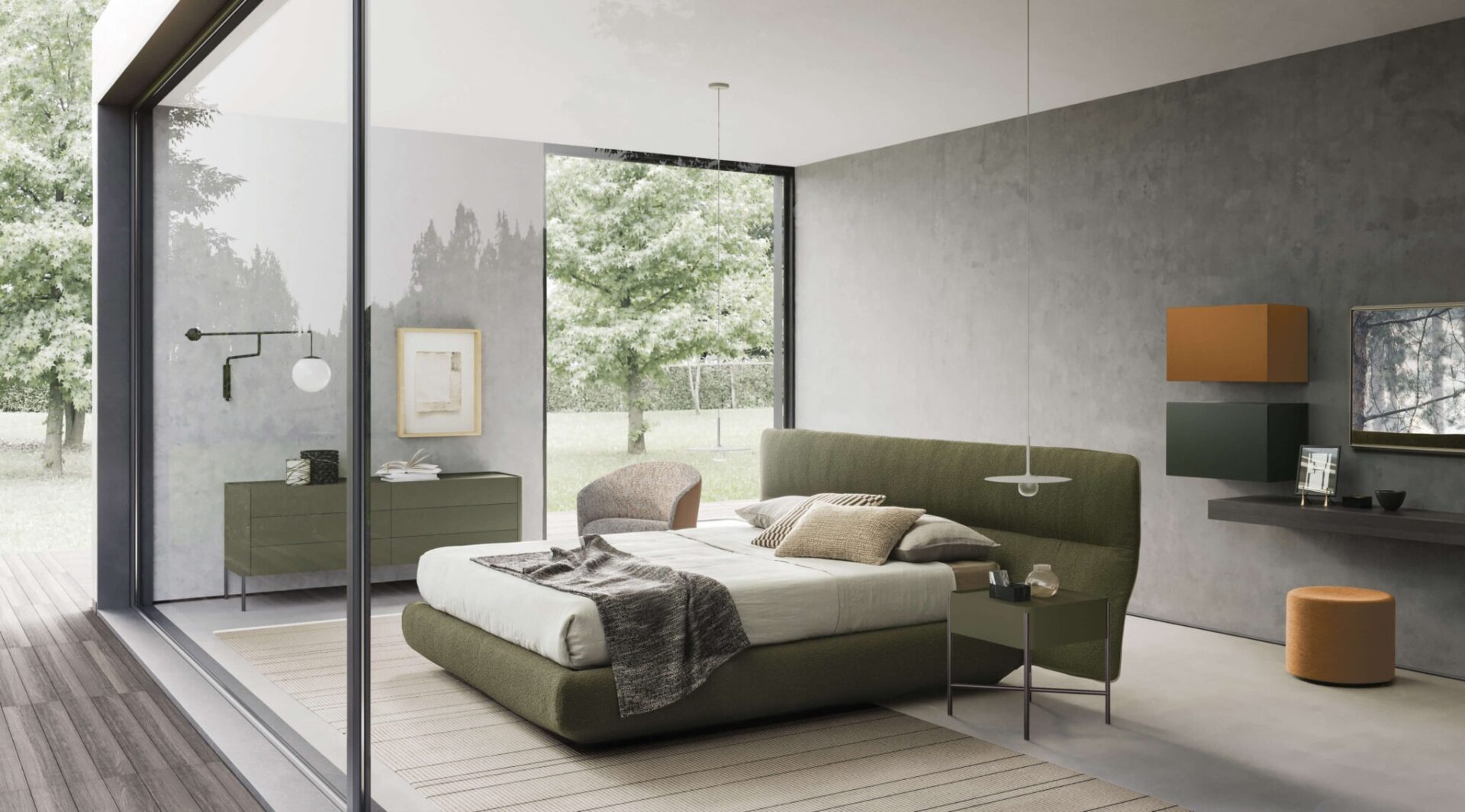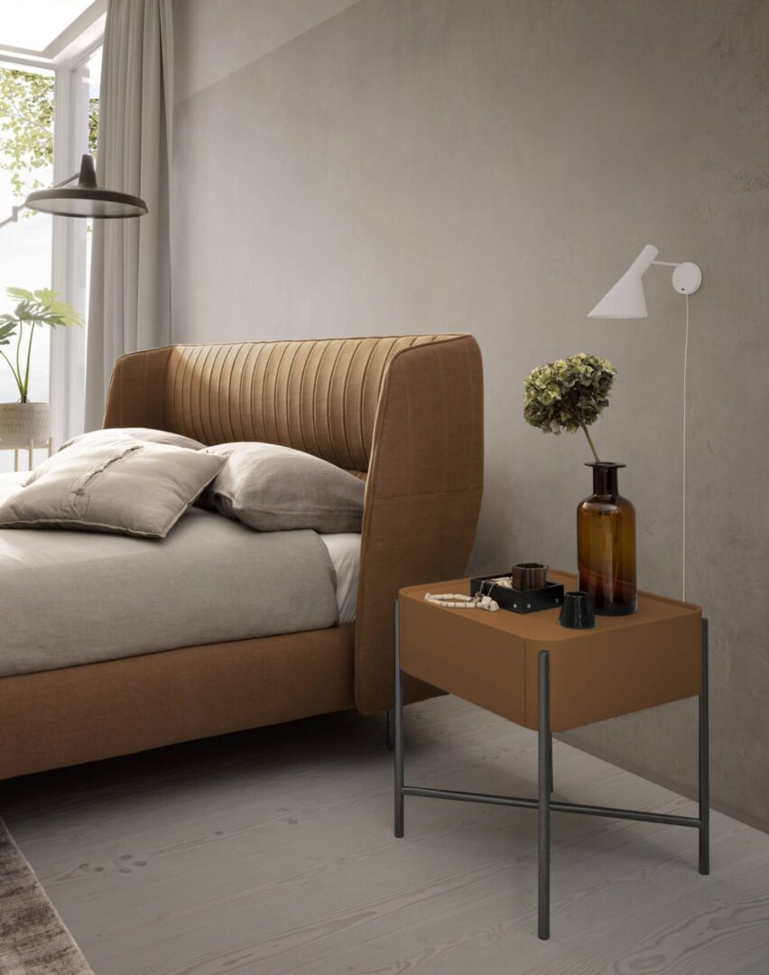 Спальный гарнитур с деревянными панелями, покрытыми матовым или глянцевым лаком, и столешницей из стекла или керамики, покрытой глянцевым лаком с обратной стороны. Верхний выдвижной ящик открывается без ручки, а нижние выдвижные ящики открываются двухтактно. Хромированное основание также может быть выполнено из черного никеля, черной эпоксидной смолы или стандартного металла.