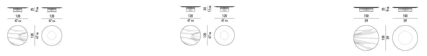 Столик доступен в трёх вариантах размеров: диаметр 120 см, высота 25 см; диаметр 120 см, высота 30 см; диаметр 150 см, высота 25 см.