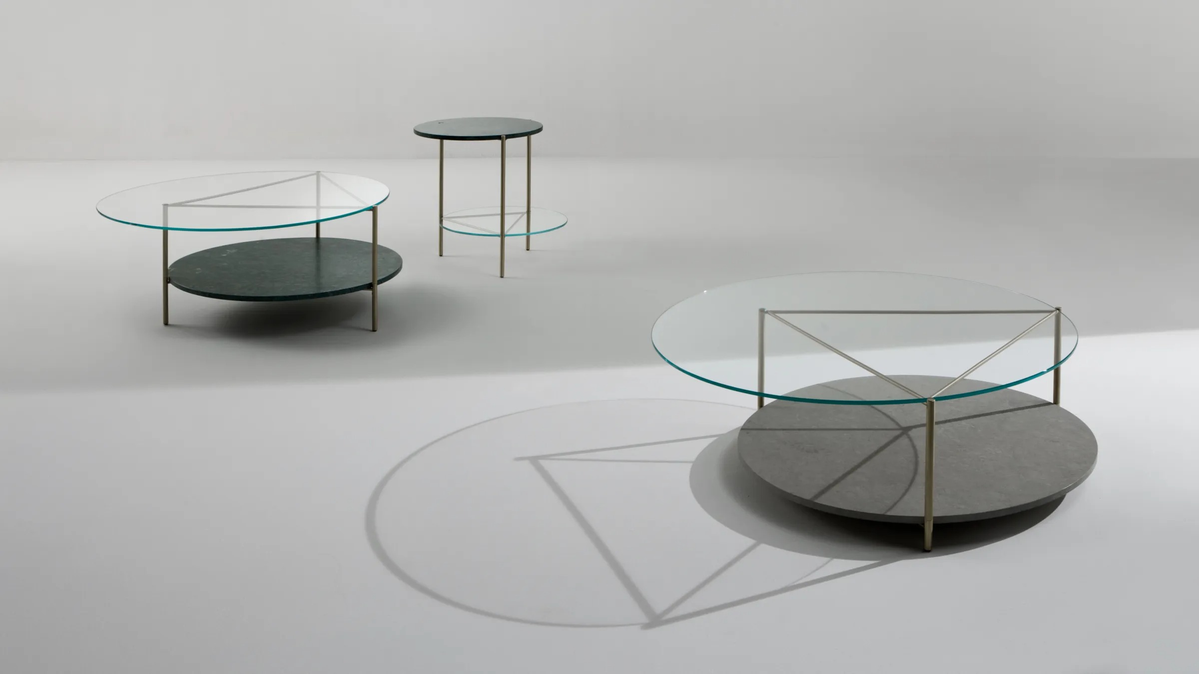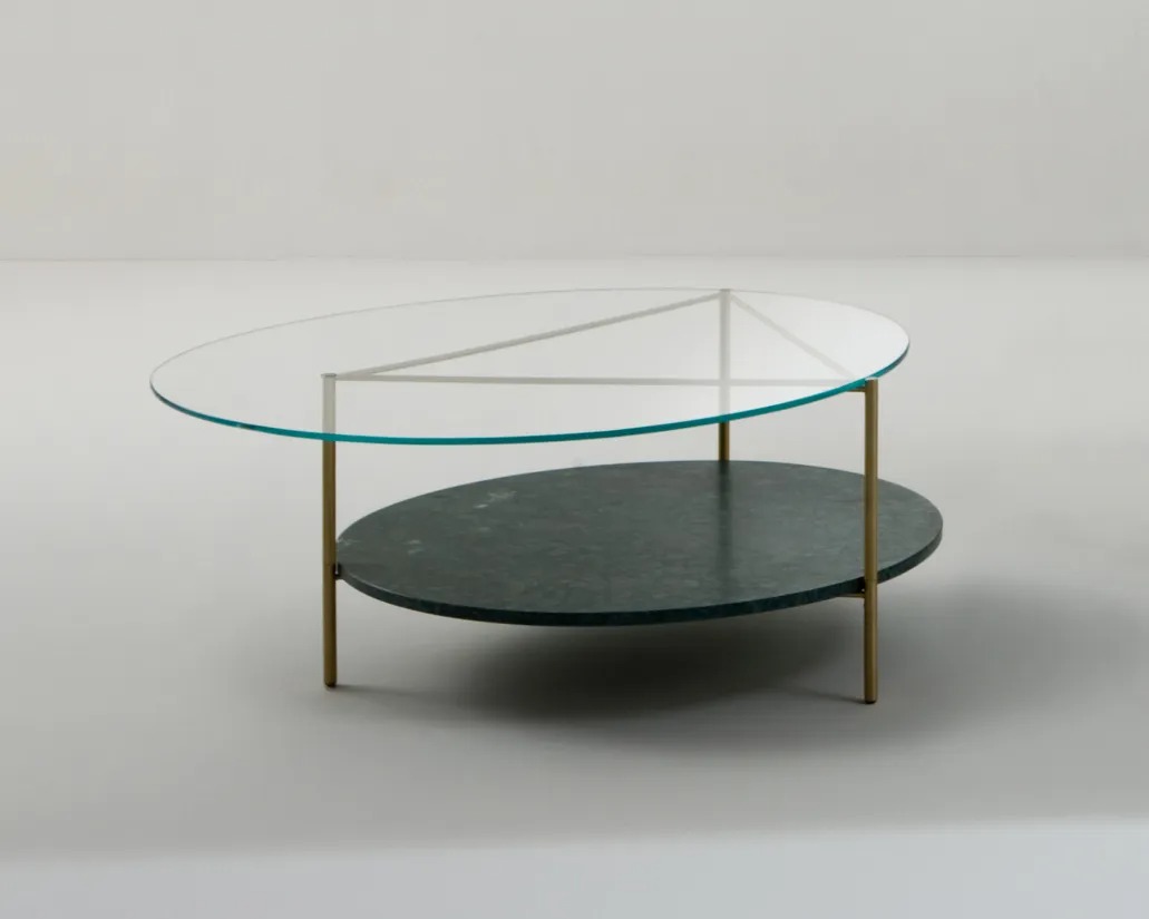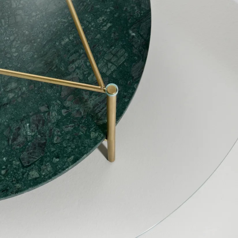 Комплект круглых столиков с основанием из сатинированной латуни с одной столешницей из свехпрозрачного хрустального стекла, а другой – из мрамора доступен в трех размерах.