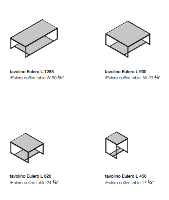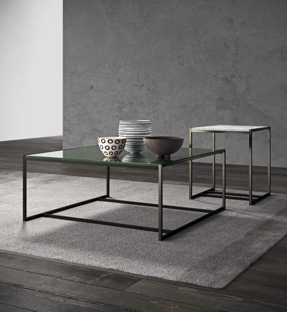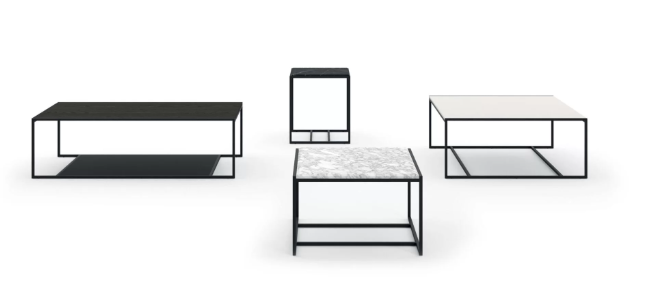 Конструкция, состоящая из окрашенной трубчатой металлической рамы квадратного сечения, доступна в стандартном исполнении из черной эпоксидной смолы или металла. Квадратная или прямоугольная столешница толщиной 12 мм может быть покрыта матовым лаком, стеклом, покрытым лаком с обратной стороны, или полированным мрамором.