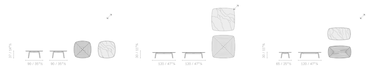 Основание изготовлено из массива ясеня цвета мока или венге с характерным треугольным поперечным сечением. Столешница боковых столиков Fiorile может быть выполнена из кожи Pelle Frau®, березовой фанеры с инкрустацией из шпона ясеня цвета мока или венге, мрамора Arabescato Venato с глянцевой и полуглянцевой отделкой или мрамора Calacatta с глянцевой и полуглянцевой отделкой.