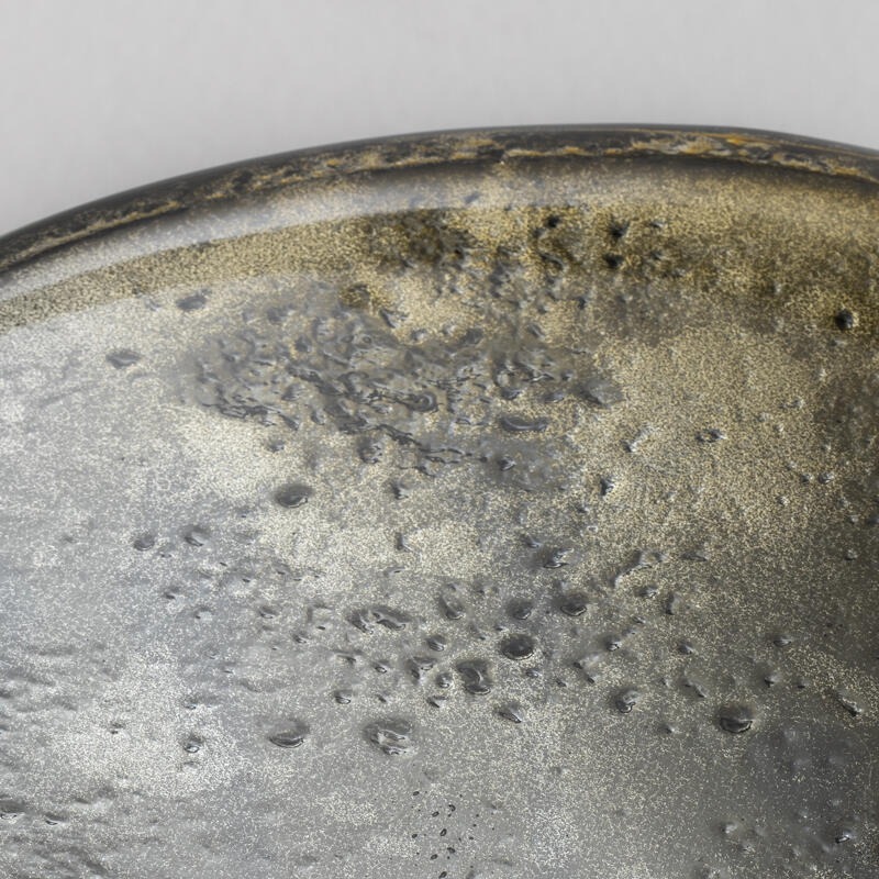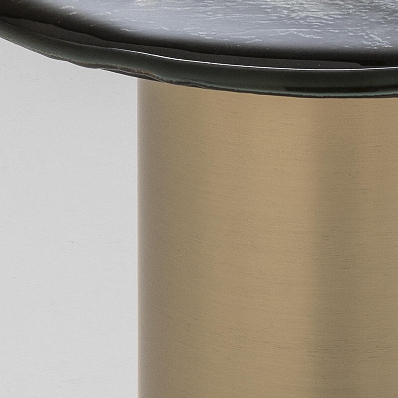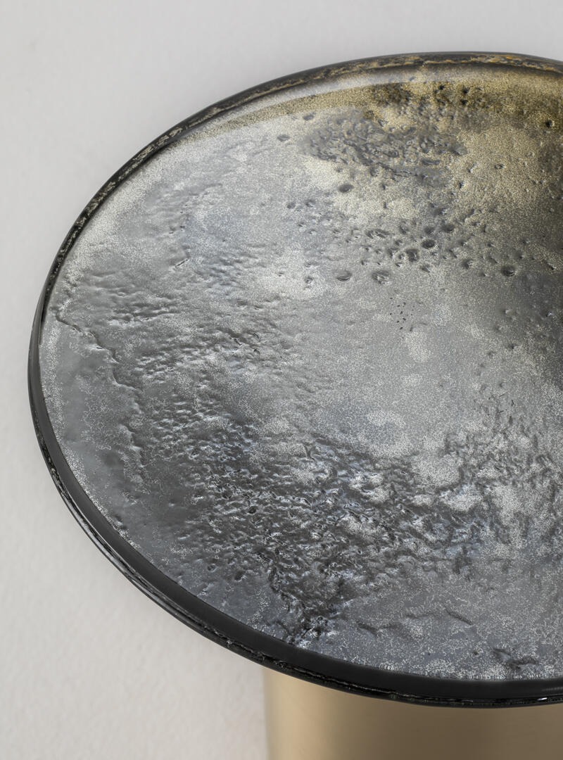 Металлическая конструкция с отделкой из матовой латуни. Столешница из двухслойного обожженного стекла с неровными краями, окрашенного от золотого до прозрачного и посеребренного под старину.