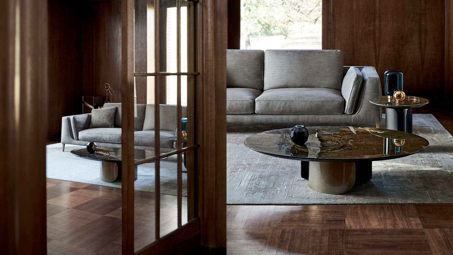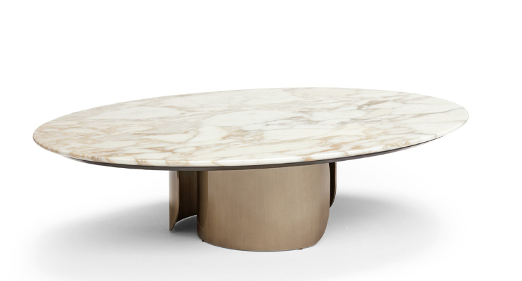 Овальный журнальный столик с металлическим основанием Gabriel отличается ярким текстурным контрастом между металлическим основанием и столешницей из изысканного мрамора. Цилиндрическая конструкция открывается с одной стороны, демонстрируя внутреннюю полость.