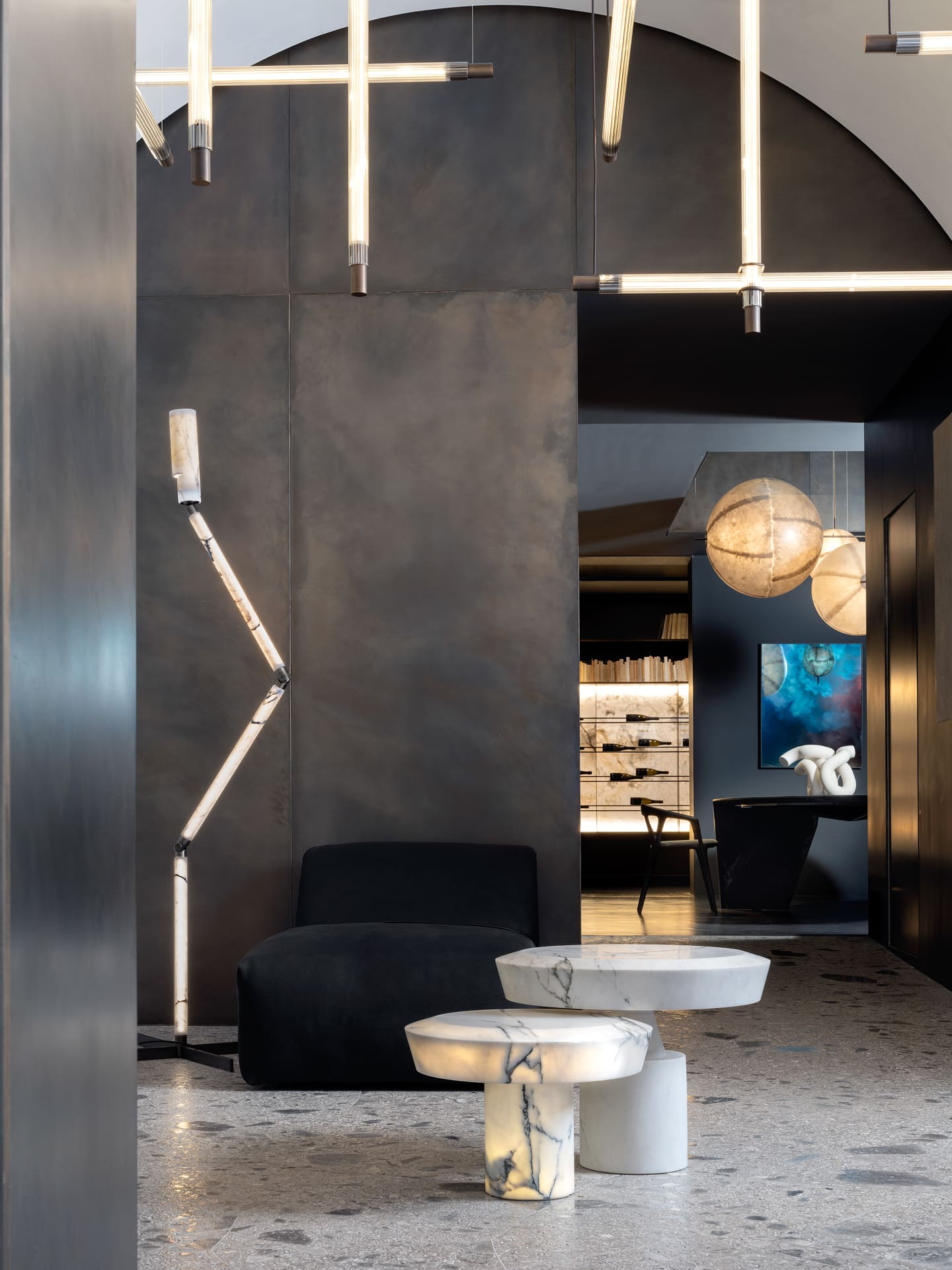 Свет сочетается с камнем, мягко исходящим от мастерски обработанных блоков Каррары, раскрывая алхимию неожиданных скрытых текстур и прожилок. He-She, дополнительная комбинация журнальных столиков, привносит в атмосферу теплоту и тактильность, создавая соблазнительную поэтическую привлекательность.