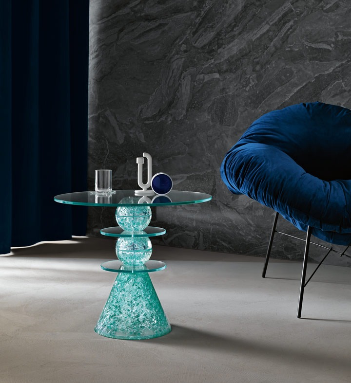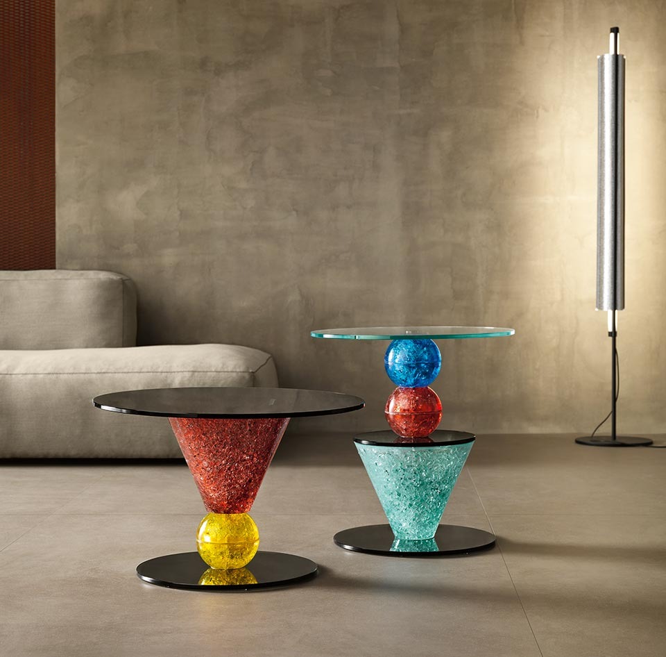 Коллекция журнальных столиков бок о бок диван страна чудес, состоит из шести частей. Каждый из них характеризуется инновационным процессом обработки, в котором используется смесь стеклянных осколков, цветных или нейтральных, формованных для формирования конусов и сфер, которые служат опорной структурой самого журнального столика.