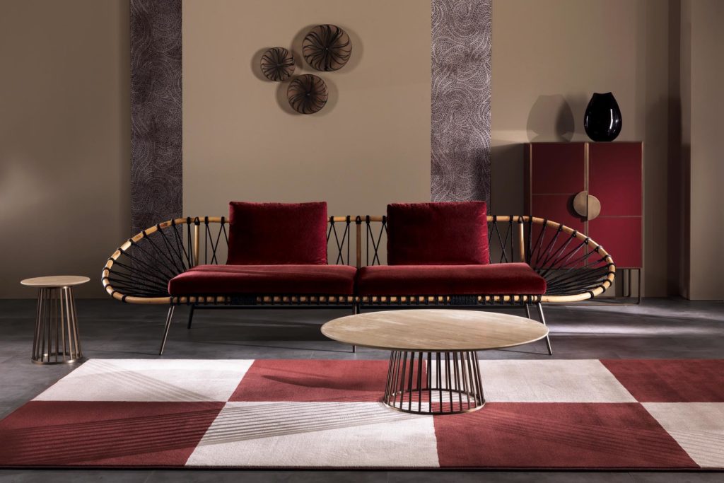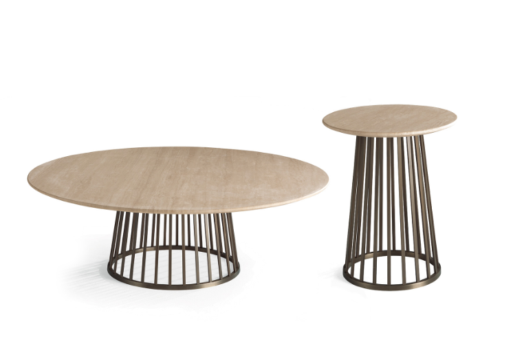 Боковой стол имеет диаметр 40 см и высоту 49 см. Центральный журнальный столик имеет диаметр 110 см и высоту 39 см.
