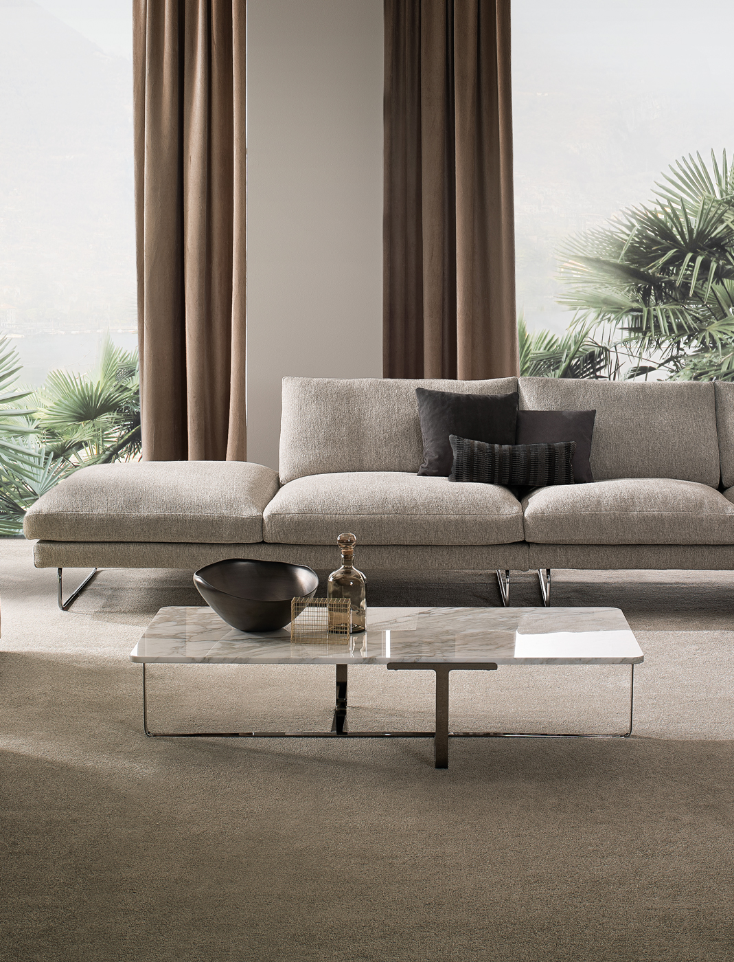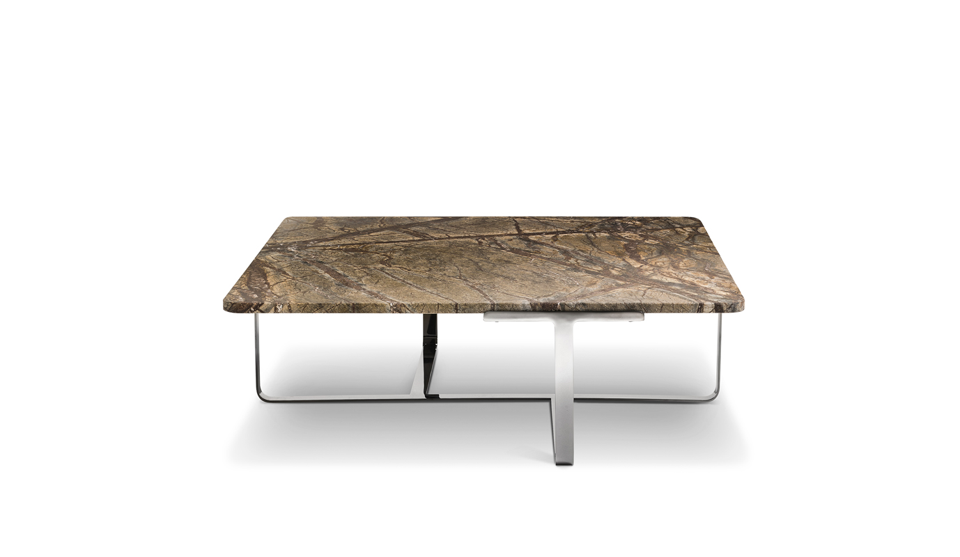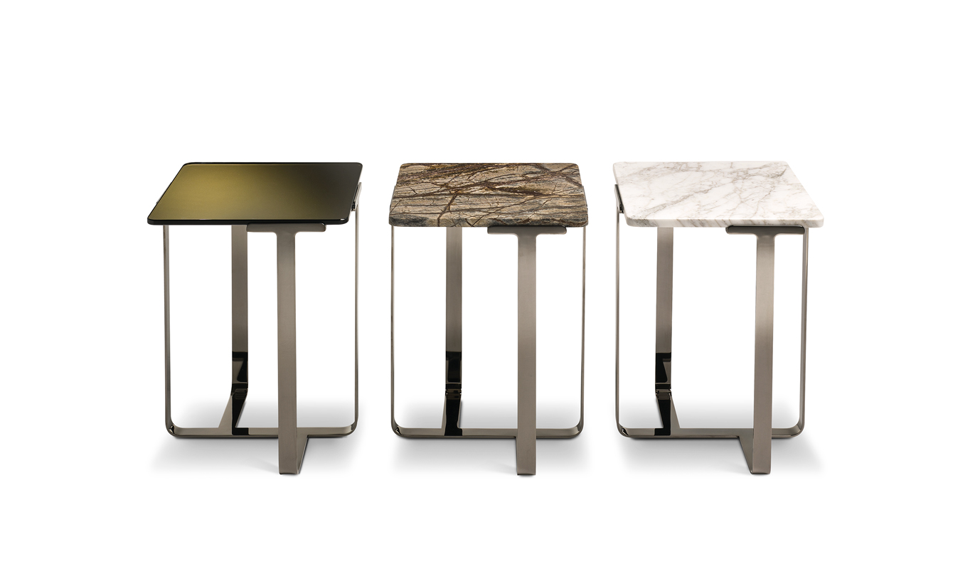 Прямоугольные и квадратные низкие столики Joshua 4-х различных размеров и высоты имеют изогнутую плоскую раму из стального профиля, а столешницы могут быть выполнены из бронзового стекла с алюминиевой подложкой, мрамора, мягкой кожи или седельной обивки.