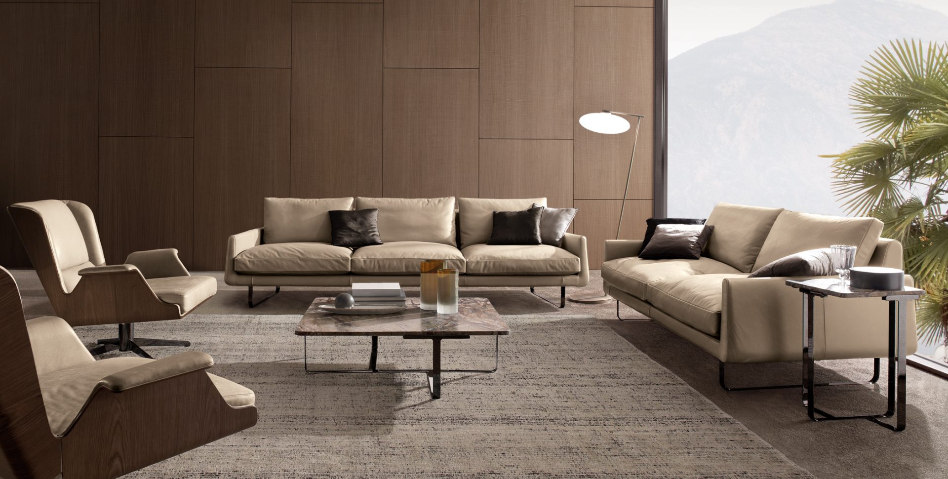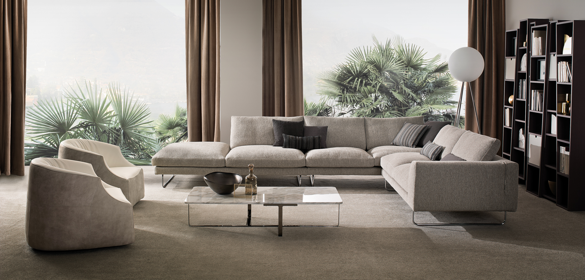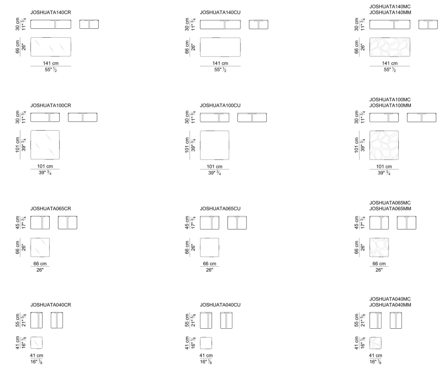 Прямоугольные и квадратные низкие столики Joshua 4-х различных размеров и высоты имеют изогнутую плоскую раму из стального профиля, а столешницы могут быть выполнены из бронзового стекла с алюминиевой подложкой, мрамора, мягкой кожи или седельной обивки.