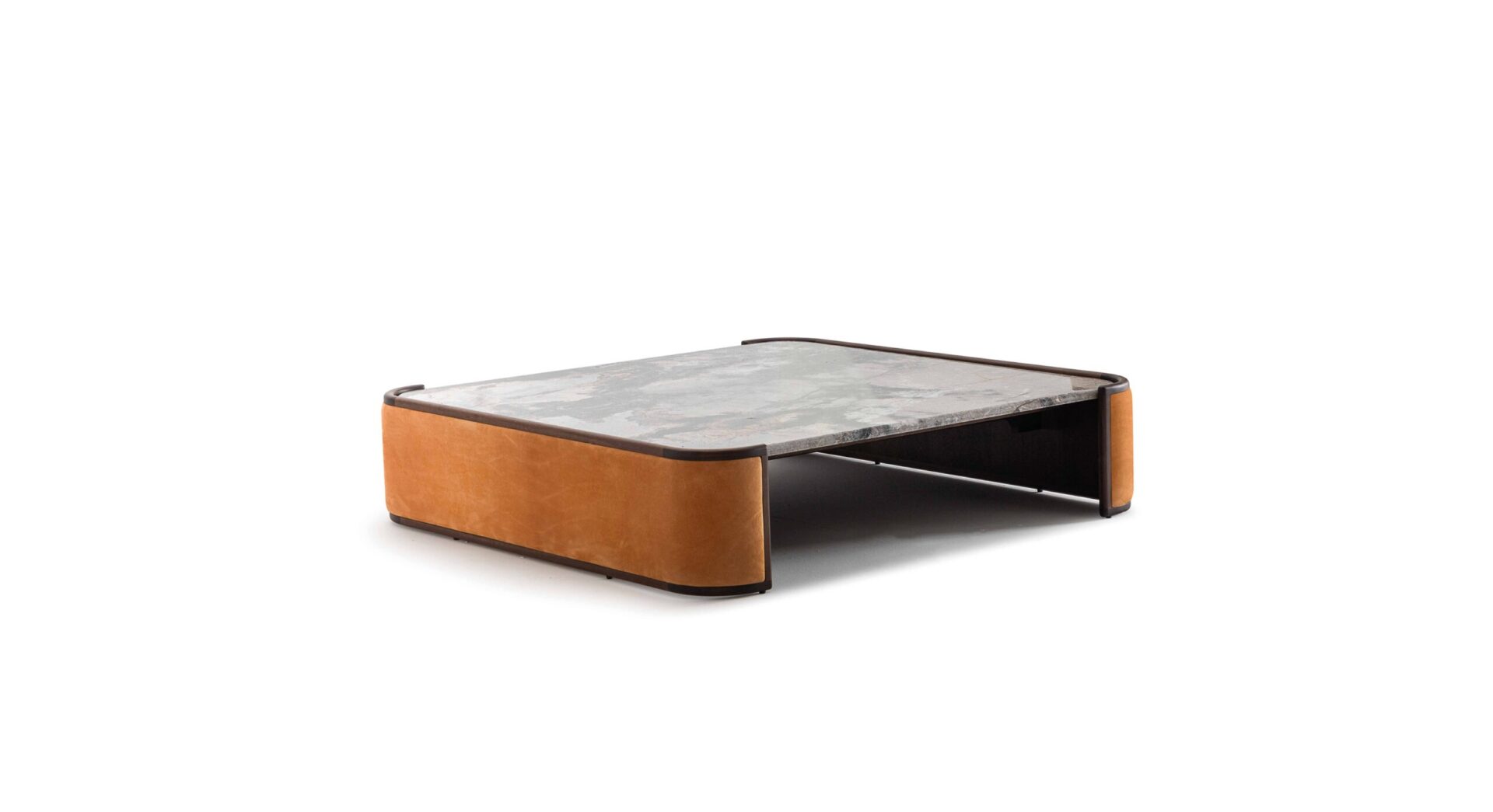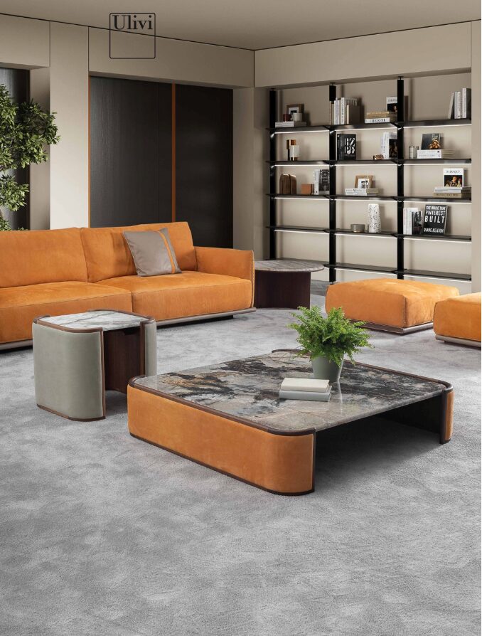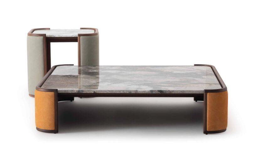 Kalid сочетает в себе прочность массива американского ореха с мягкими объемами мраморного верха, обернутого боковинами, которые могут быть деревянными или обтянутыми кожей, доступными в эксклюзивных категориях оливковых гостиных.