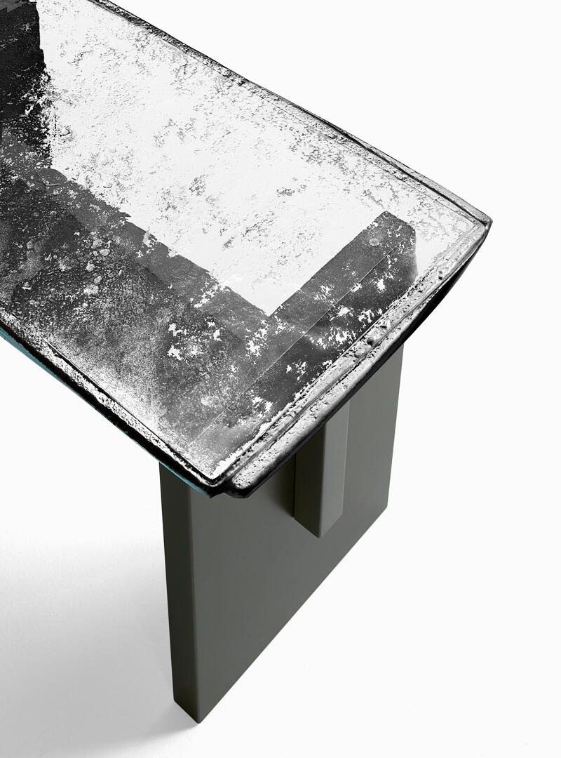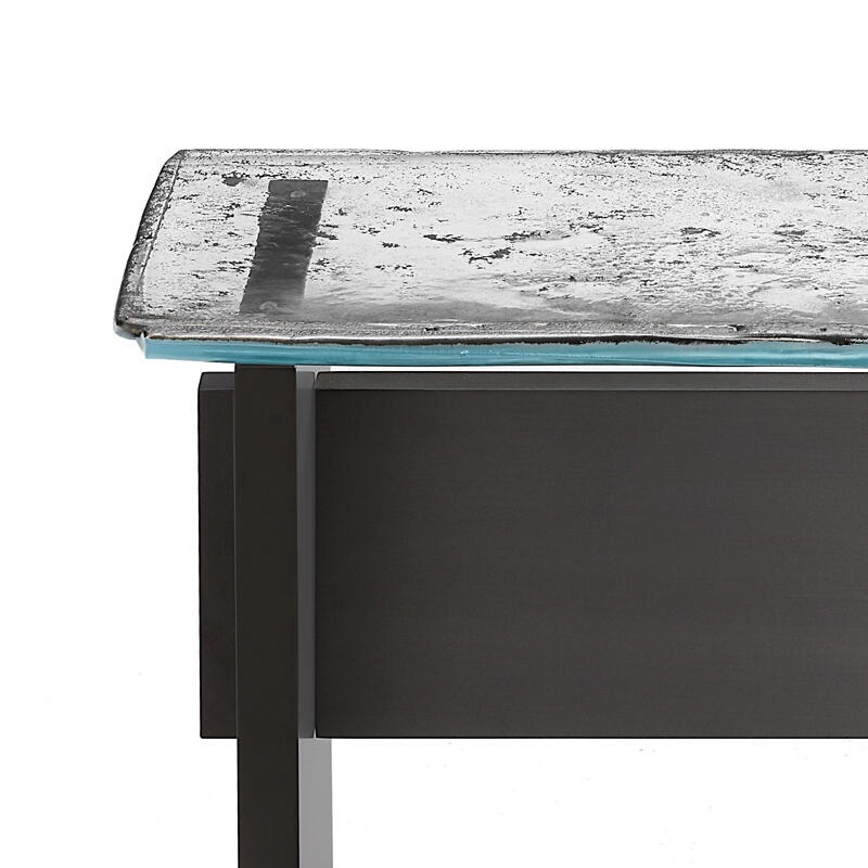 Столешница выполнена из двух слоев зеркального обожженного стекла с неровными краями. Матово-черная лакированная поверхность с многослойной деревянной структурой.
