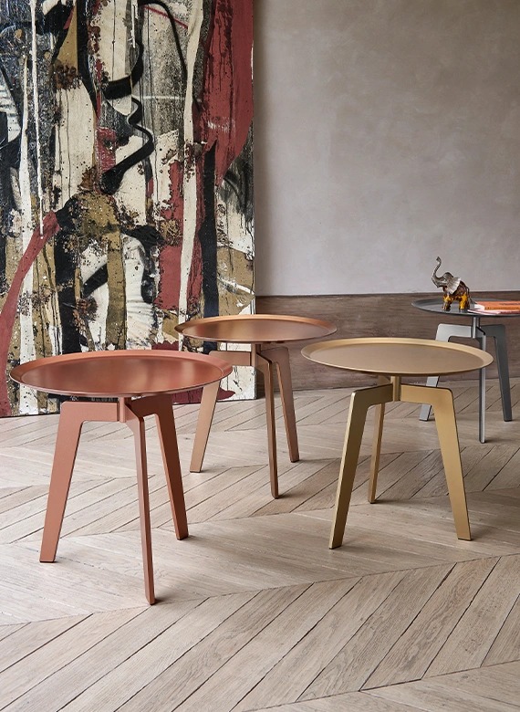 Lotus предлагает линейку универсальных журнальных столиков в винтажном стиле, доступных с верхним слоем из лакированного дерева или шпона толщиной 20 мм или из керамики со скошенным краем толщиной 12 мм. основание выполнено из коричневого лакированного металла, свинца, бронзы, латуни, меди.