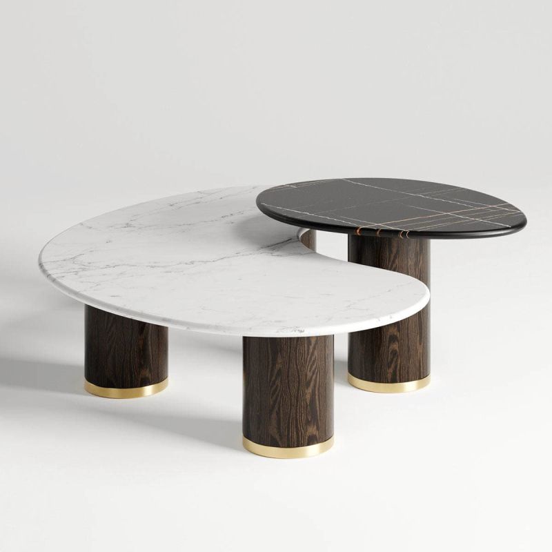Журнальный столик имеет размеры 134 × 123 × 36 см (ш × г × в). Приставной столик имеет размеры 78 × 60 × 46 см (ш × г × в).
