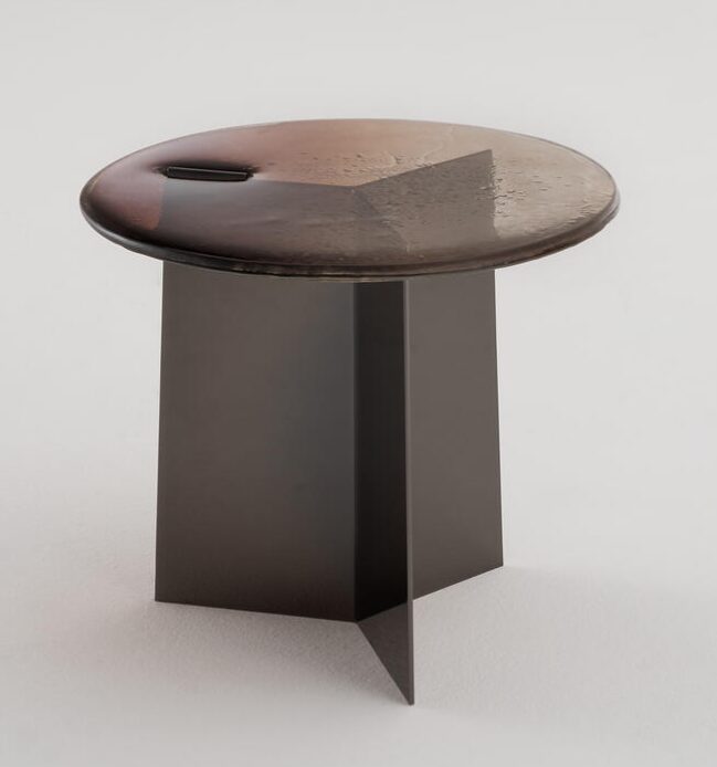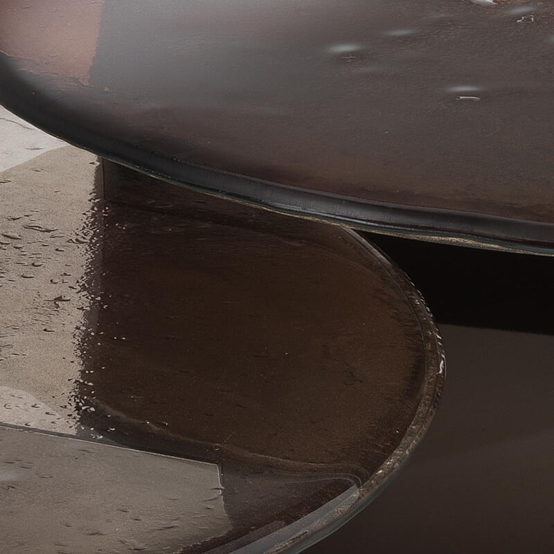 Столешница из обожженного стекла в два слоя с неровными краями, окрашена от бронзового до прозрачного, с частичным посеребрением с обратной стороны.