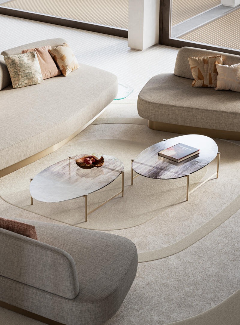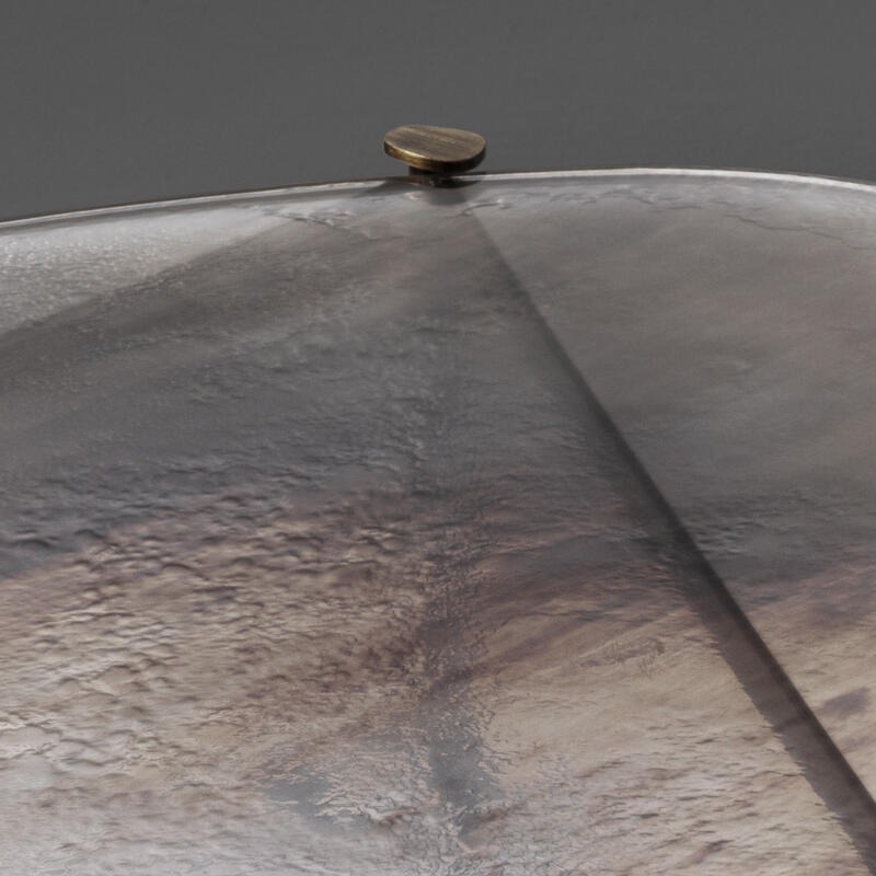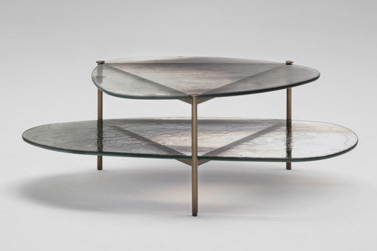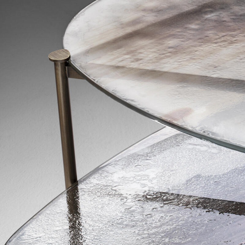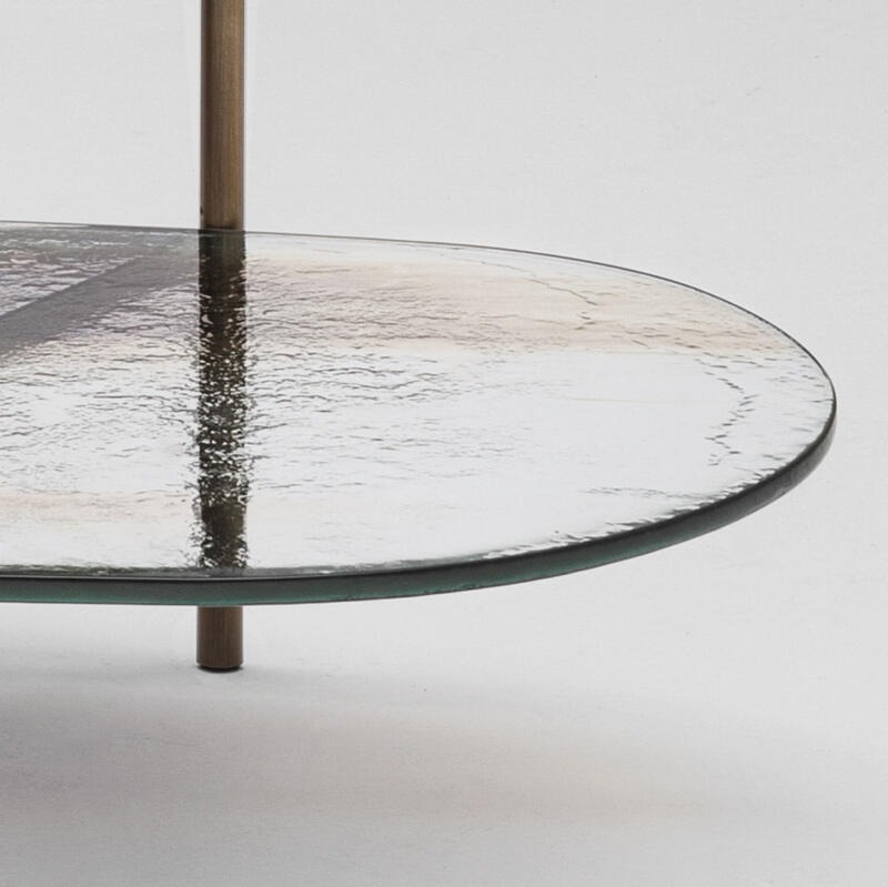 Металлическая конструкция с матовой отделкой из полированной латуни. Столешница из двухуровневого стекла толщиной 12 мм с отделкой в стиле Барбареско.