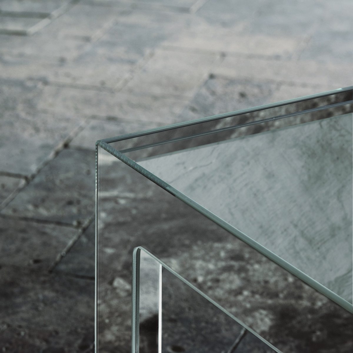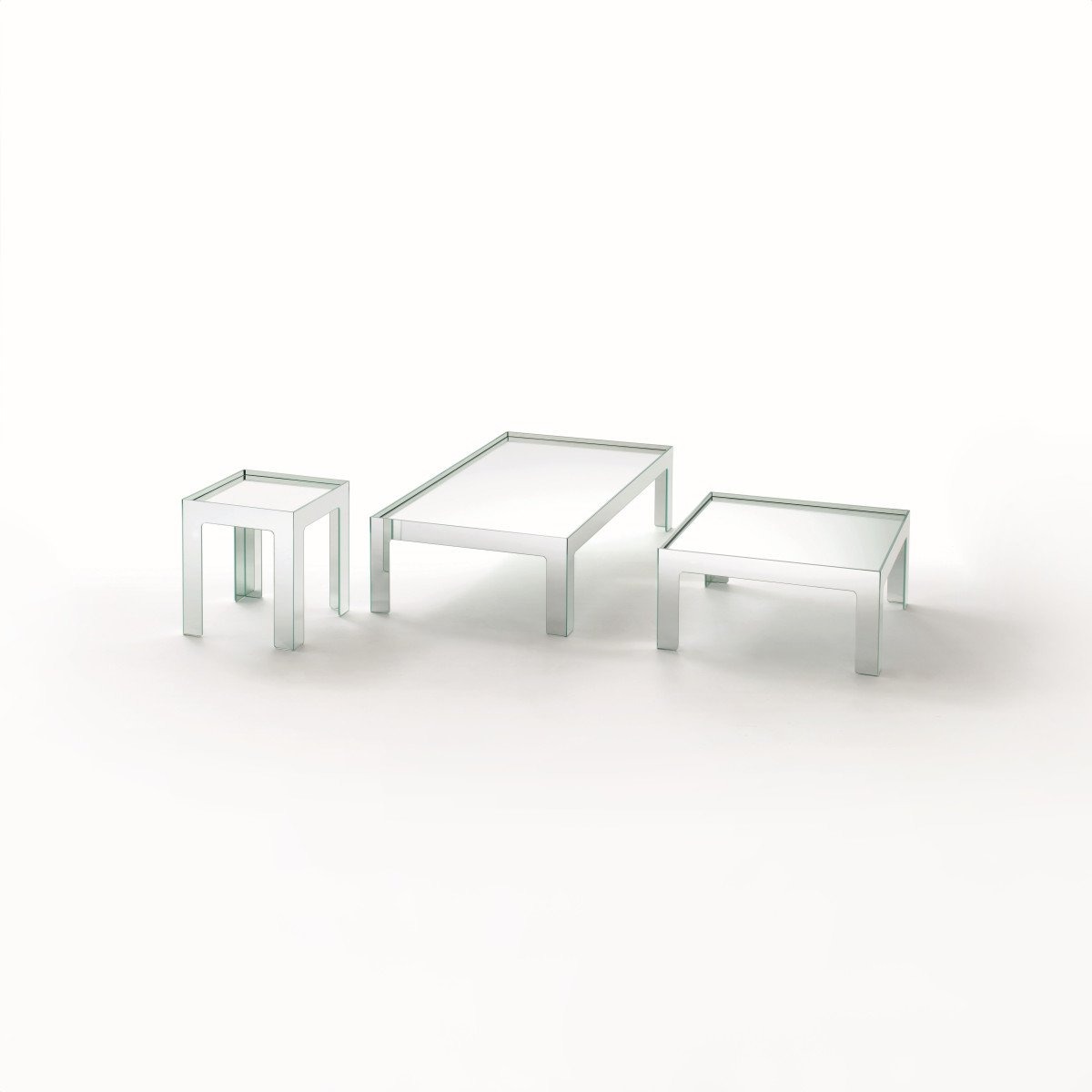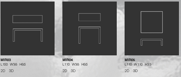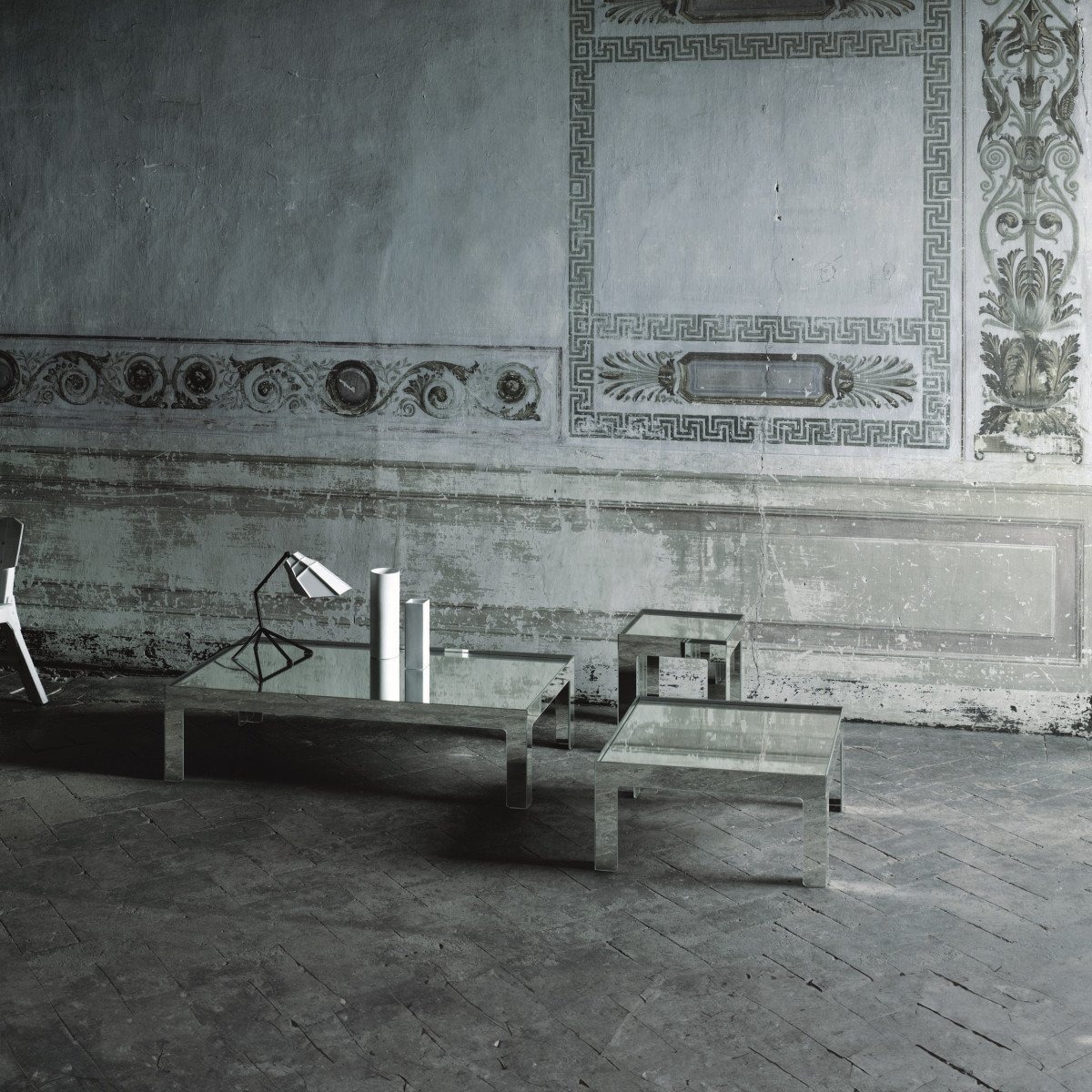 Коллекция низких столиков и консолей, доступных в различных размерах, основание которых изготовлено путем склеивания двухсторонних ламинированных зеркальных плит с водоструйной обработкой под углом 45°. В низких столиках зеркальная столешница расположена ниже каркаса основания, так что ее удерживает профиль стойки. В консолях верхняя часть вместо этого опирается на базовую раму.