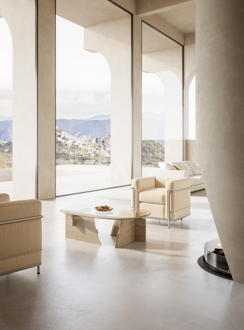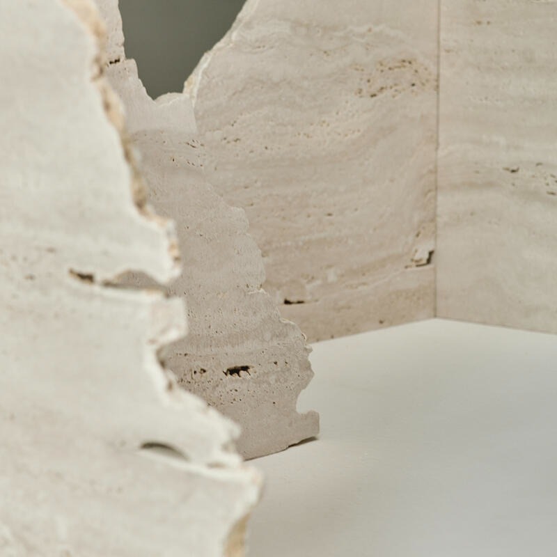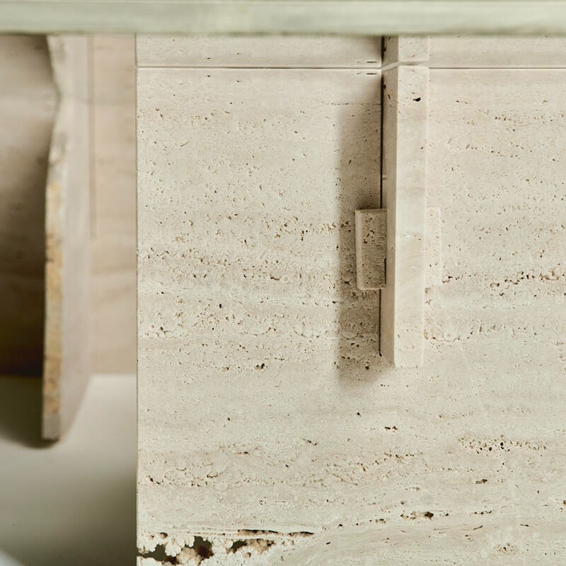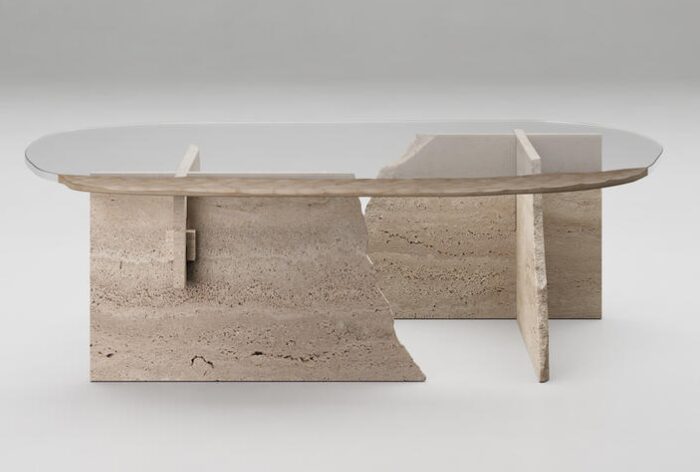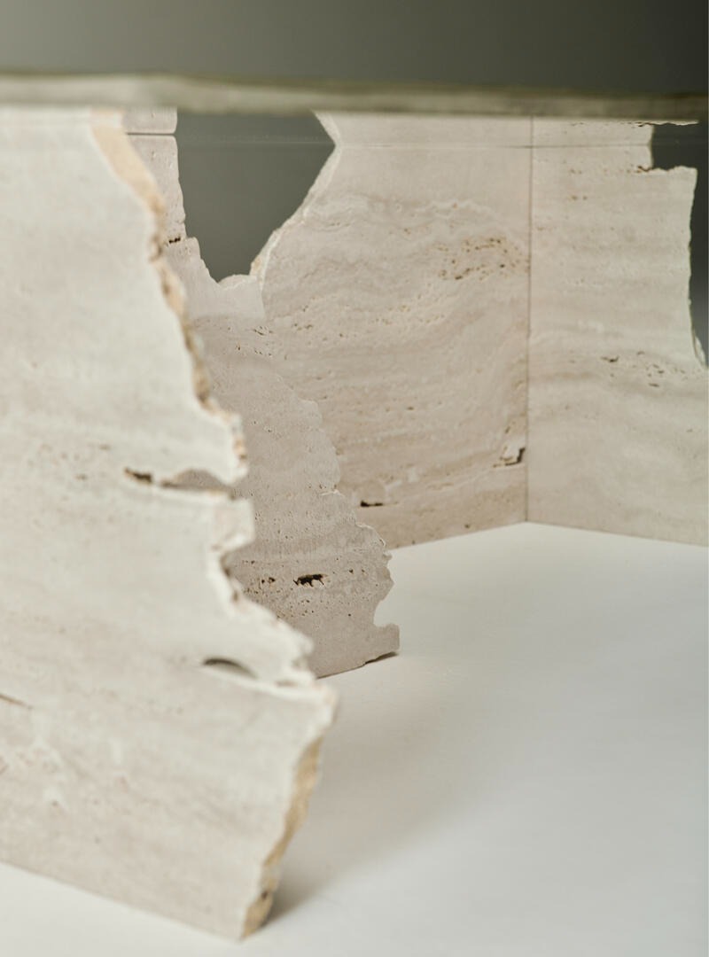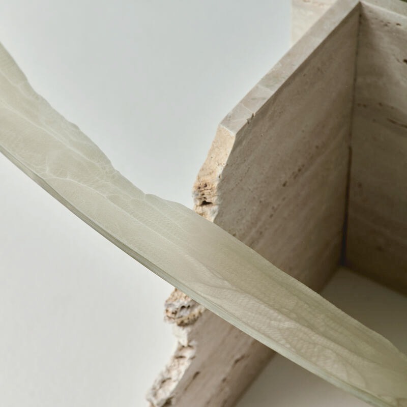 Столешница из сверхпрозрачного стекла, украшенная матовой отделкой. Структура — травертиновый мрамор.