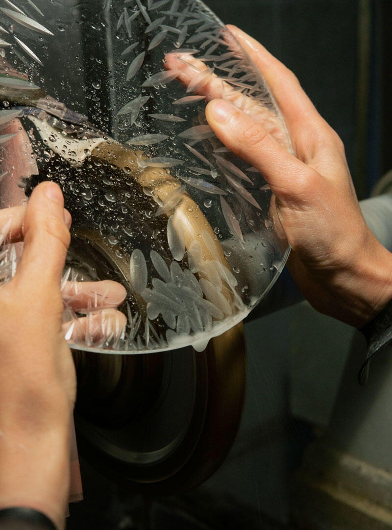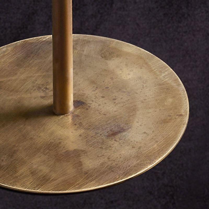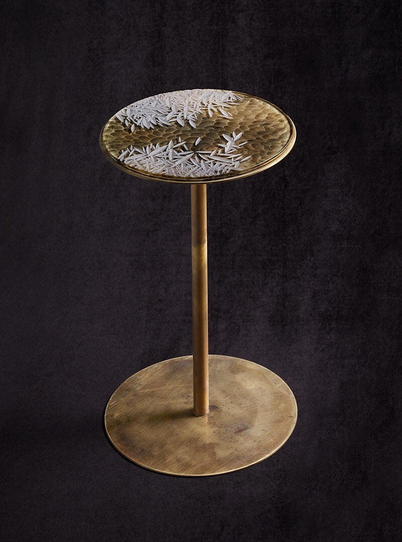 Конструкция выполнена из натуральной латуни под старину. Стеклянная столешница с гравировкой в стиле “Каннето”, поверхность посеребренная, состаренная и матовая с фаской.