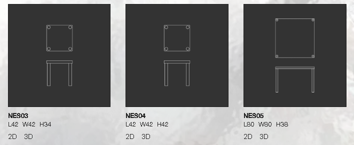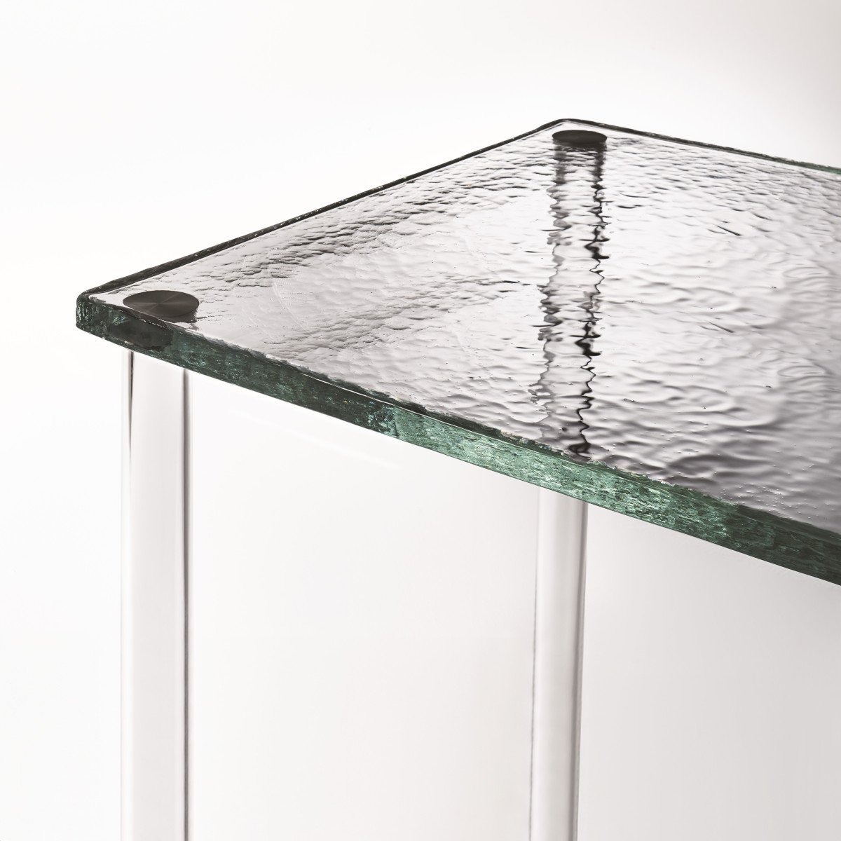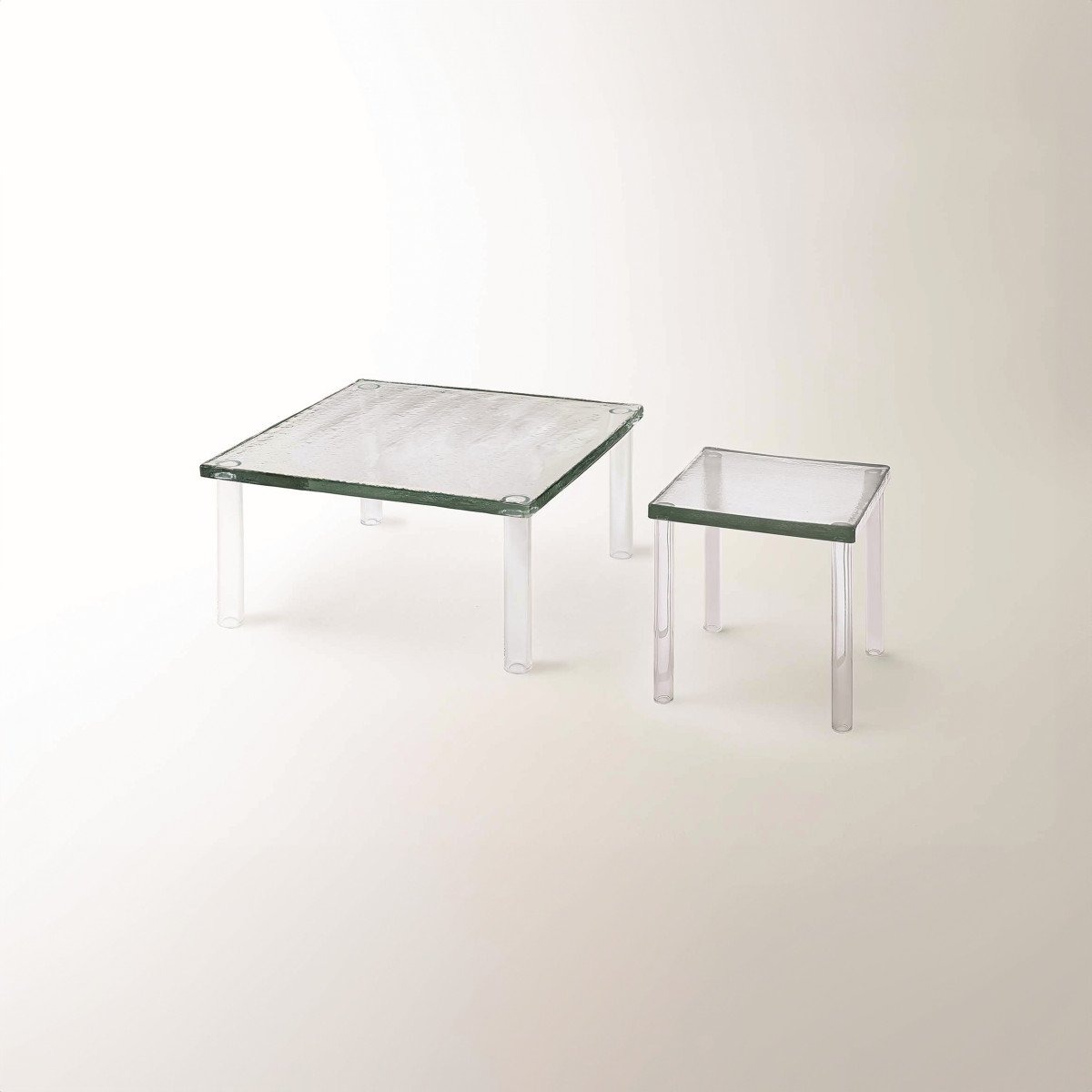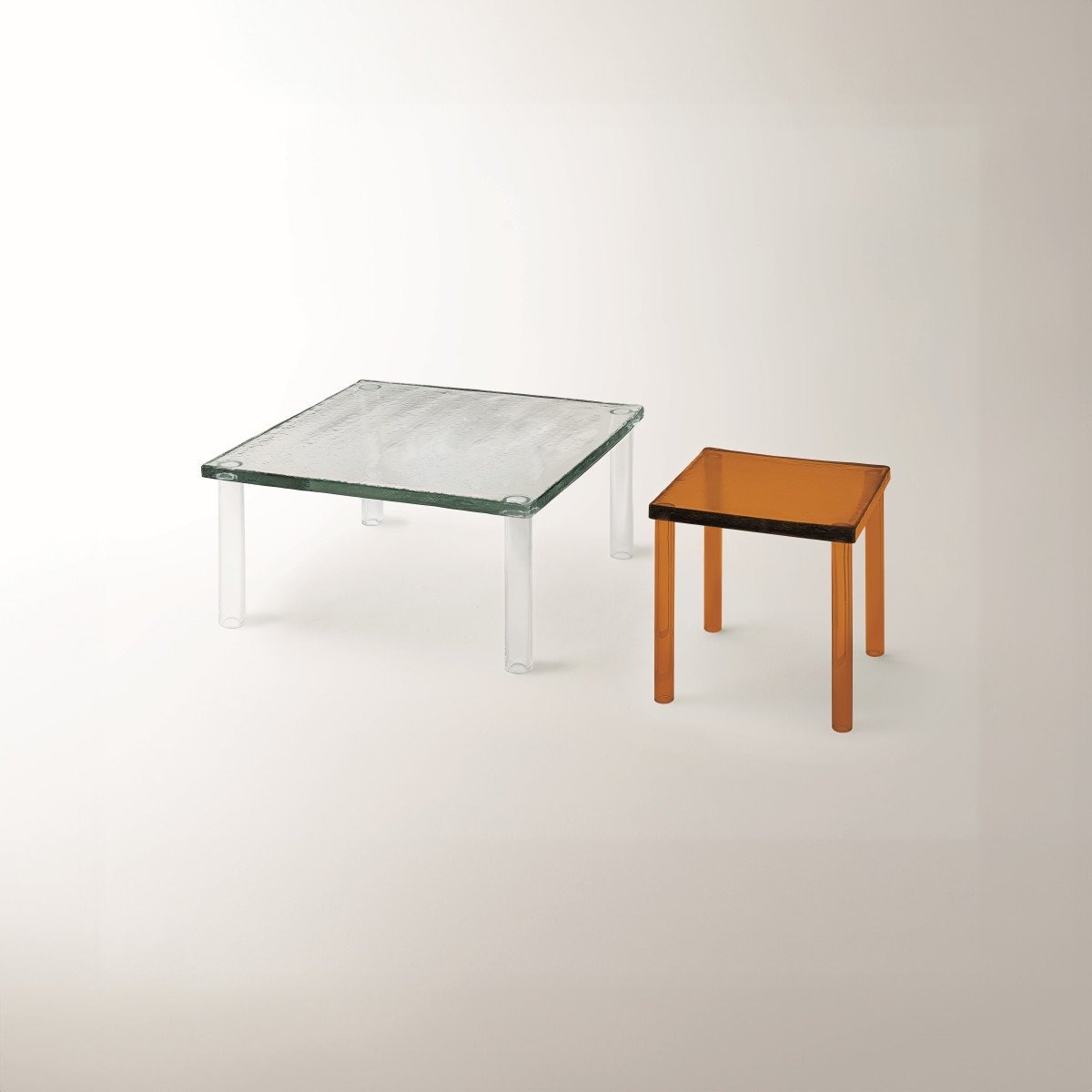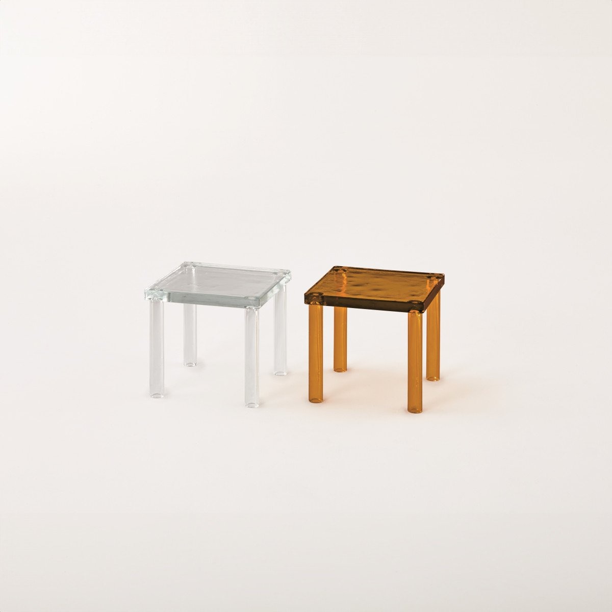 Высокие и низкие столики полностью изготовлены из муранского стекла, отличающегося необычайной прочностью и пластичностью материала. Квадратные столешницы изготовлены из очень толстого литого стекла, а цилиндрические ножки — из выдувного стекла. Доступны в янтарном или прозрачном исполнении. Ножки низкого стола приварены непосредственно к столешнице, в то время как ножки высокого стола прикреплены к столешнице пластинами из нержавеющей стали, привинченными друг к другу.