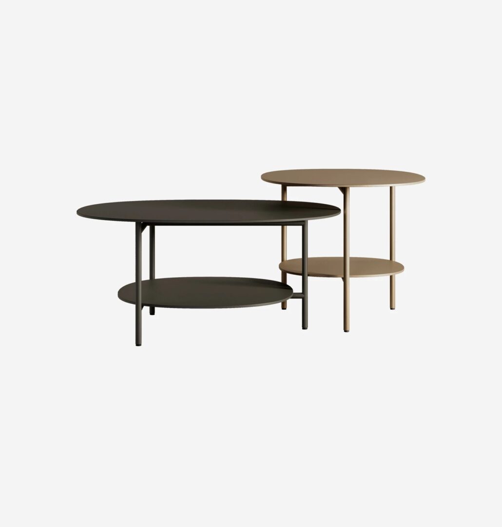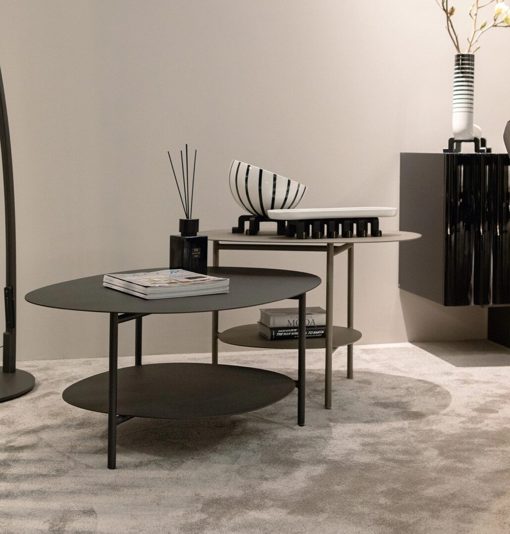 Журнальные столики oasi сочетают элегантность и функциональность: изысканные элементы мебели с чистым современным дизайном характеризуются двумя столешницами с нежными изгибами, отделанными углем, матовым золотом или бронзой.