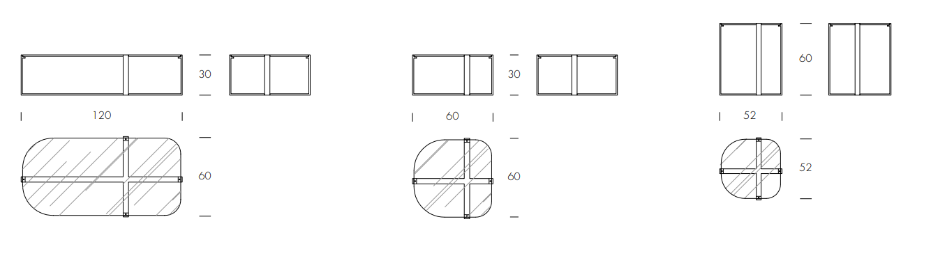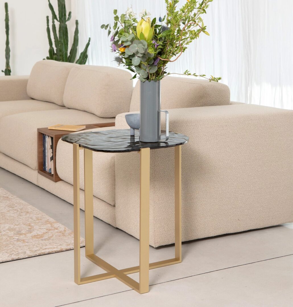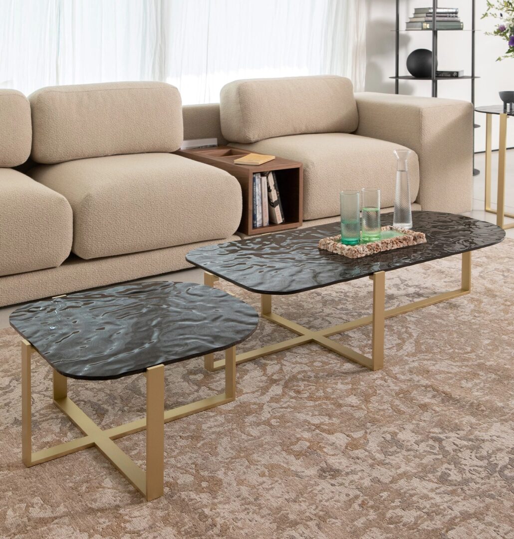 Набор из трех журнальных столиков с металлической оплеткой, с матовой золотой отделкой и дымчатым расплавленным стеклянным верхом. Эстетика минимальной геометрии основания контрастирует с легкой рябью расплавленного стекла, которая вызывает естественный элемент воды, придавая образу уникальную и ценную игру контрастов.