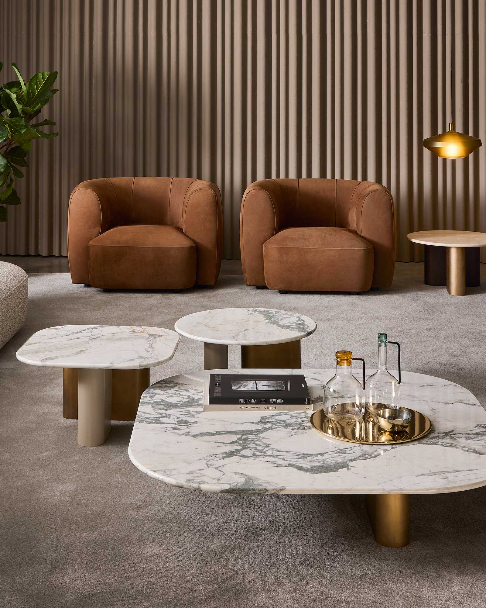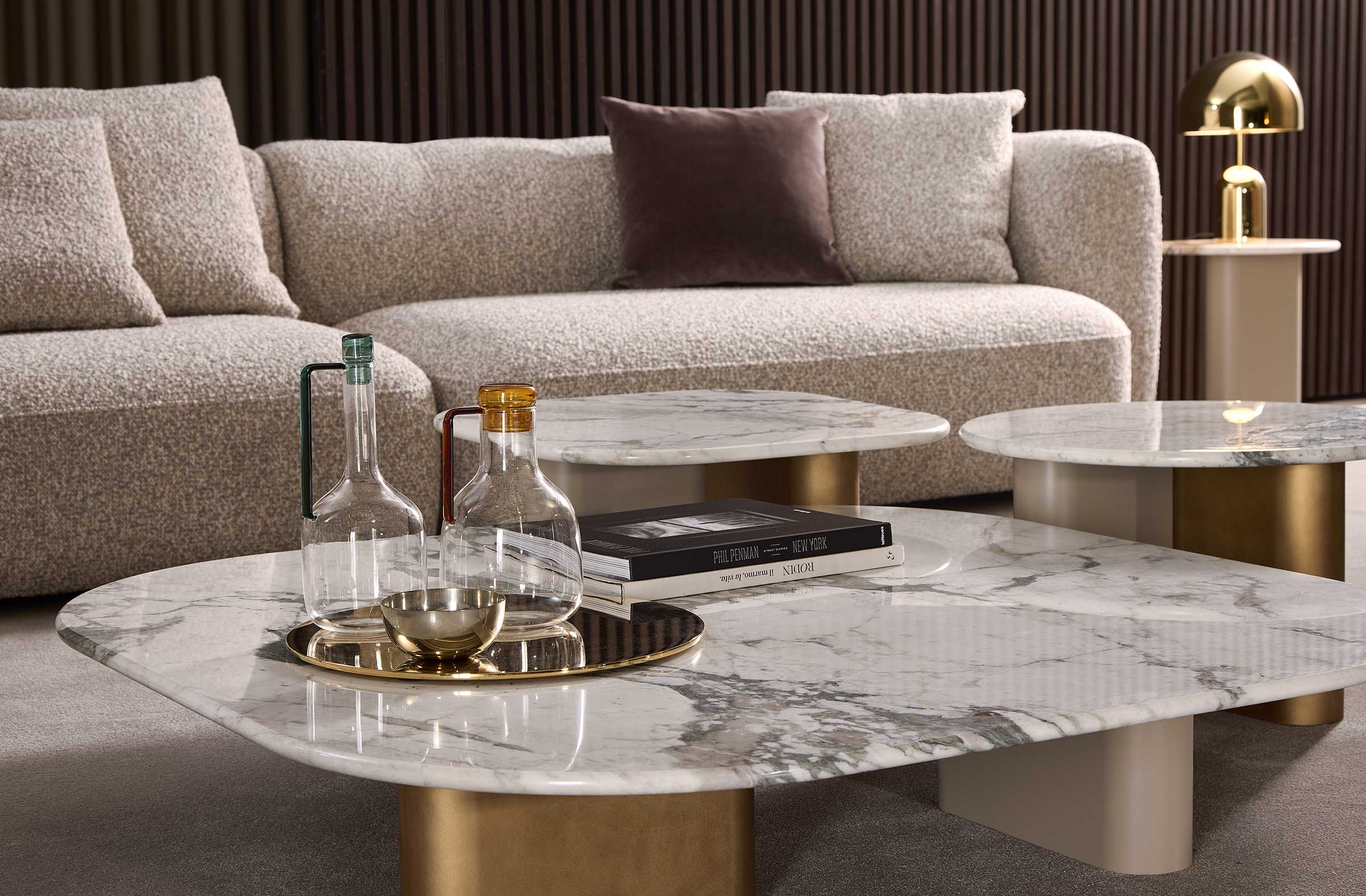 Семейство обеденных столов и столов Onno характеризуется своей органичной и скульптурной формой, что придает им большую легкость, несмотря на размеры. Особенно это заметно в конструкции закругленных ножек, которые создают объемную игру и контрастируют с легкостью столешницы.