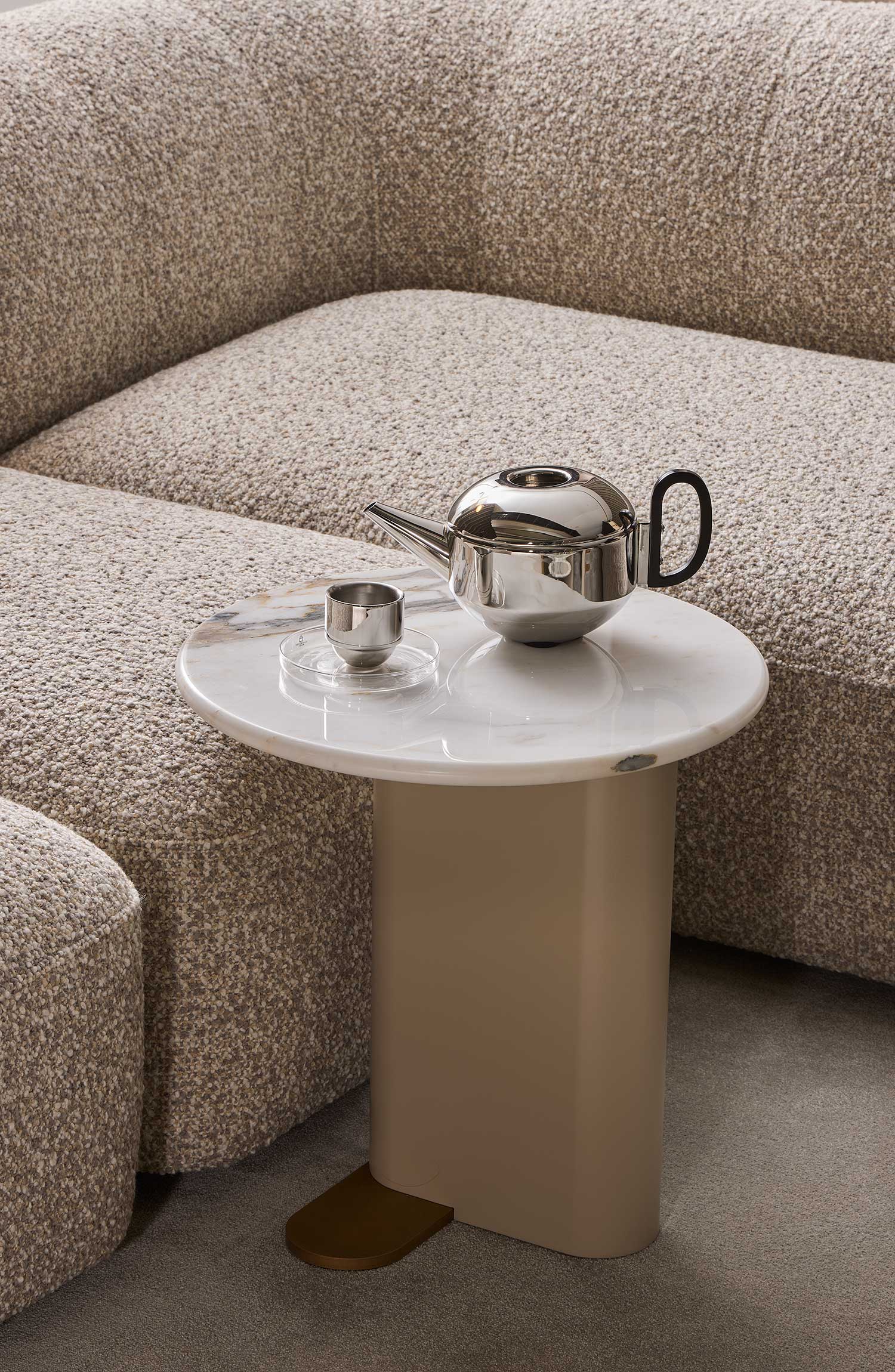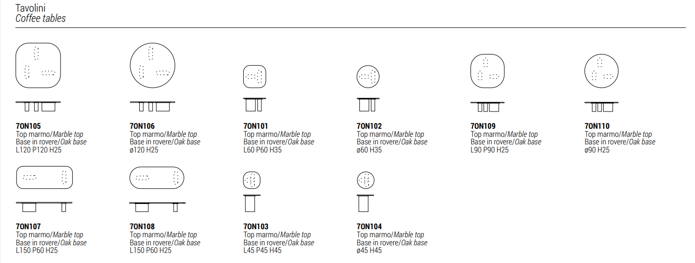 Столешница доступна в 16 вариантах мрамора (прямоугольная, квадратная или круглая), а ножки могут быть оформлены в металлической, оловянной или лакированной отделке с широким выбором цветов RAL. Итальянское качество Giulio Marelli гарантирует долговечность и безупречный стиль.