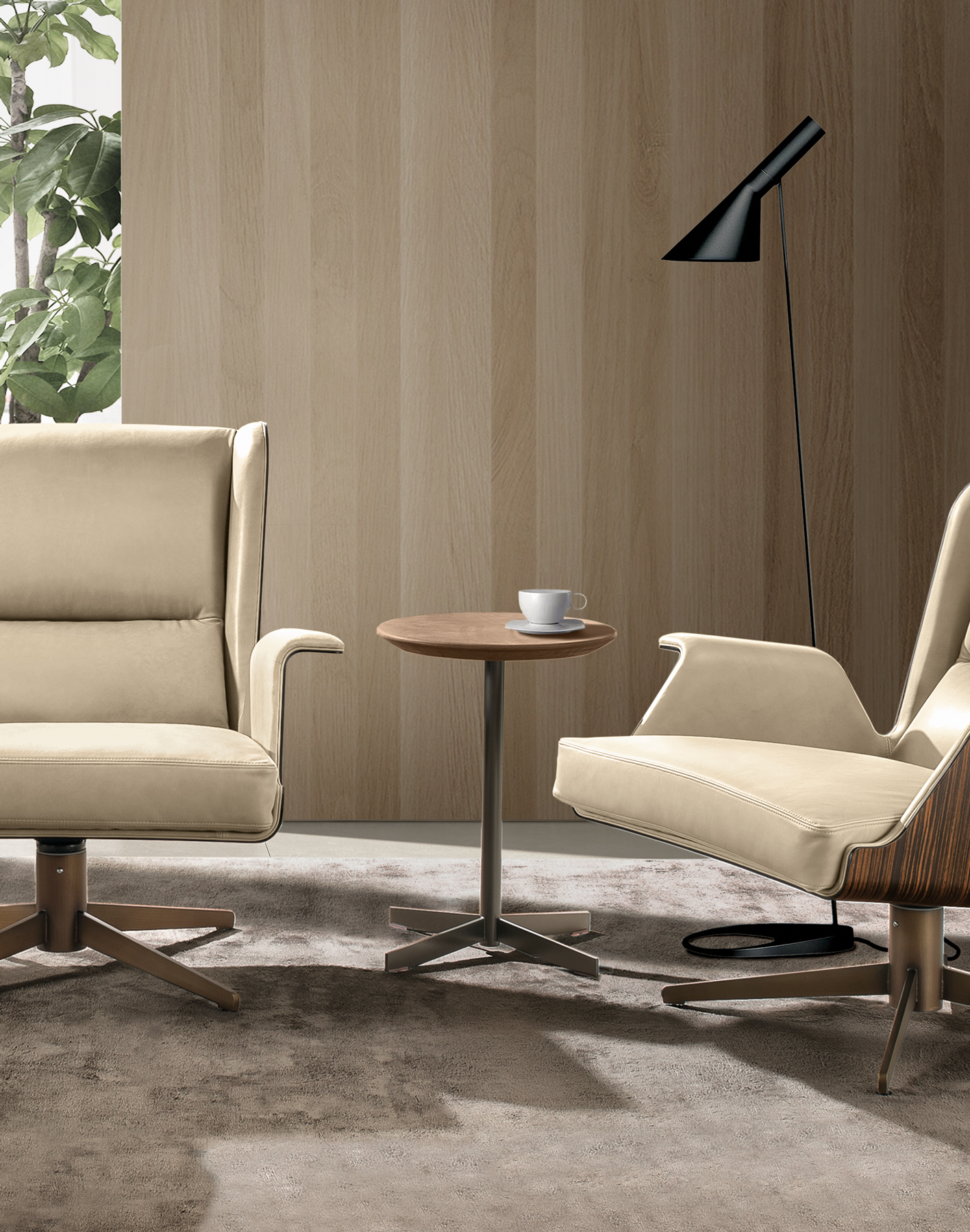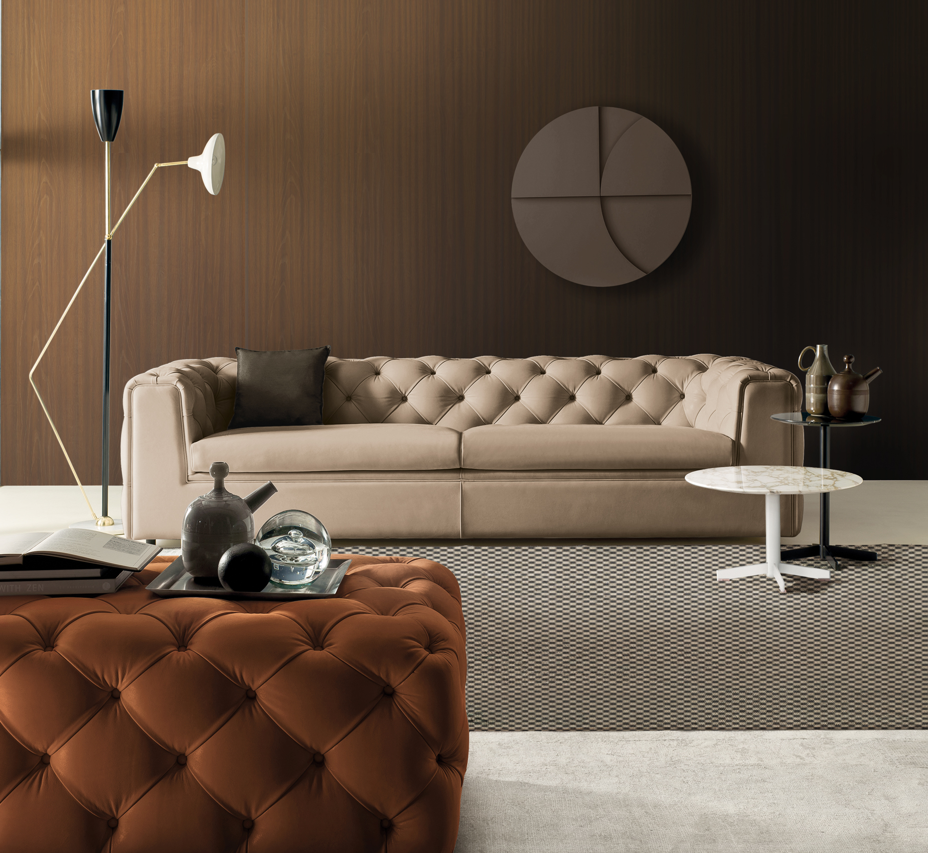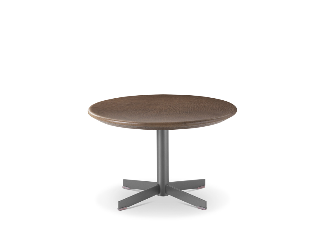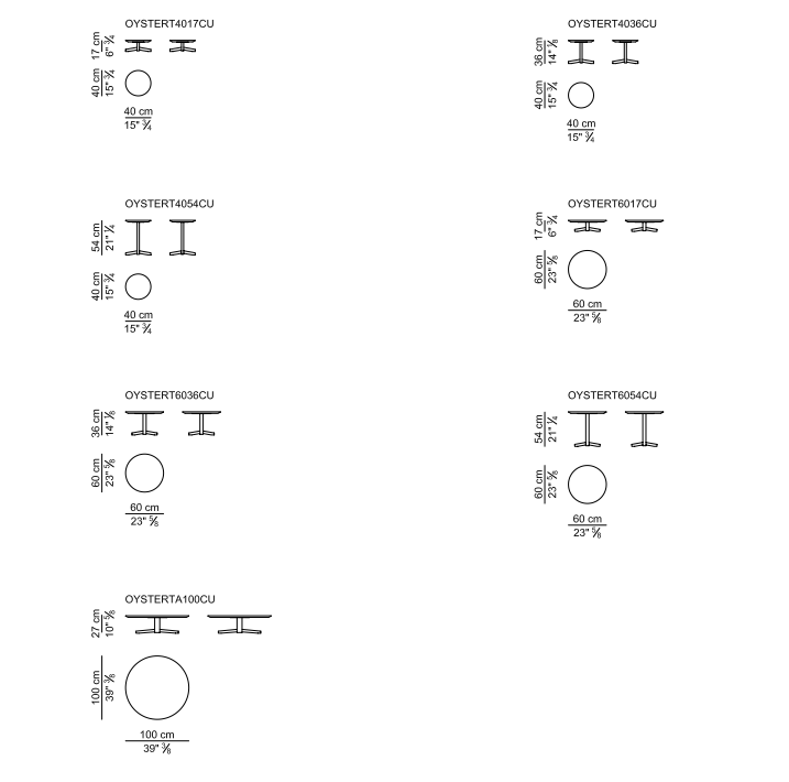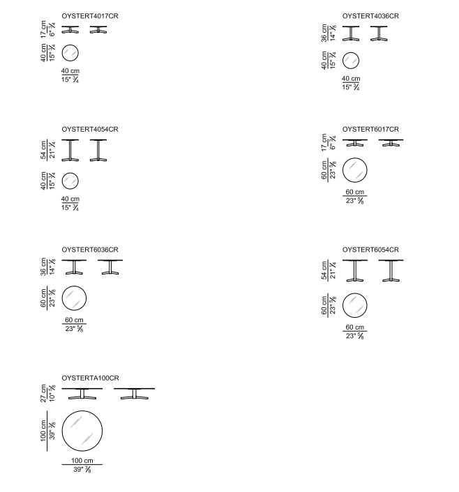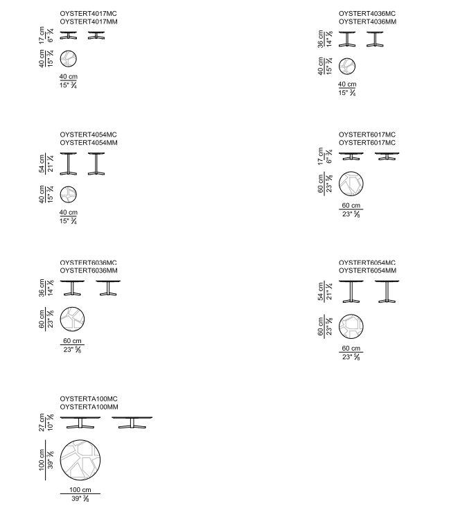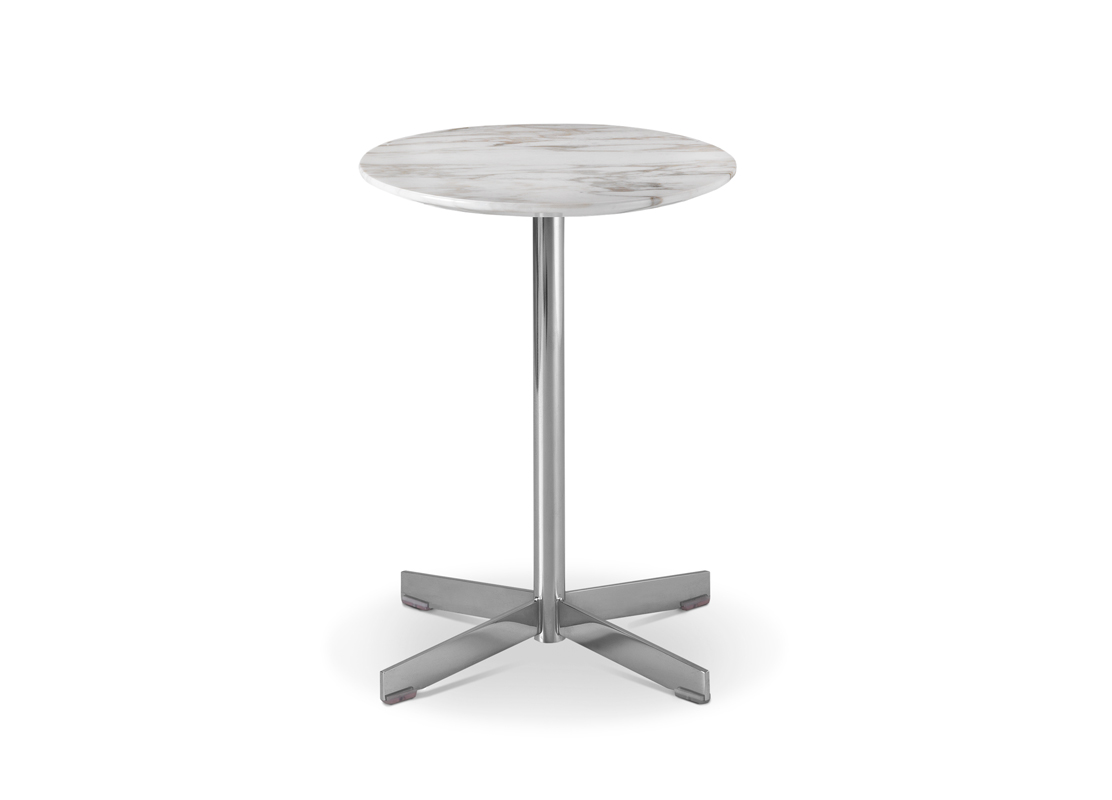 Журнальные столики с круглой столешницей разного диаметра и высоты, все с круглым трубчатым основанием с 4 стальными спицами; столешницы доступны из мрамора, натуральной кожи, стекла с белой обратной стороной, белого или черного ламината.