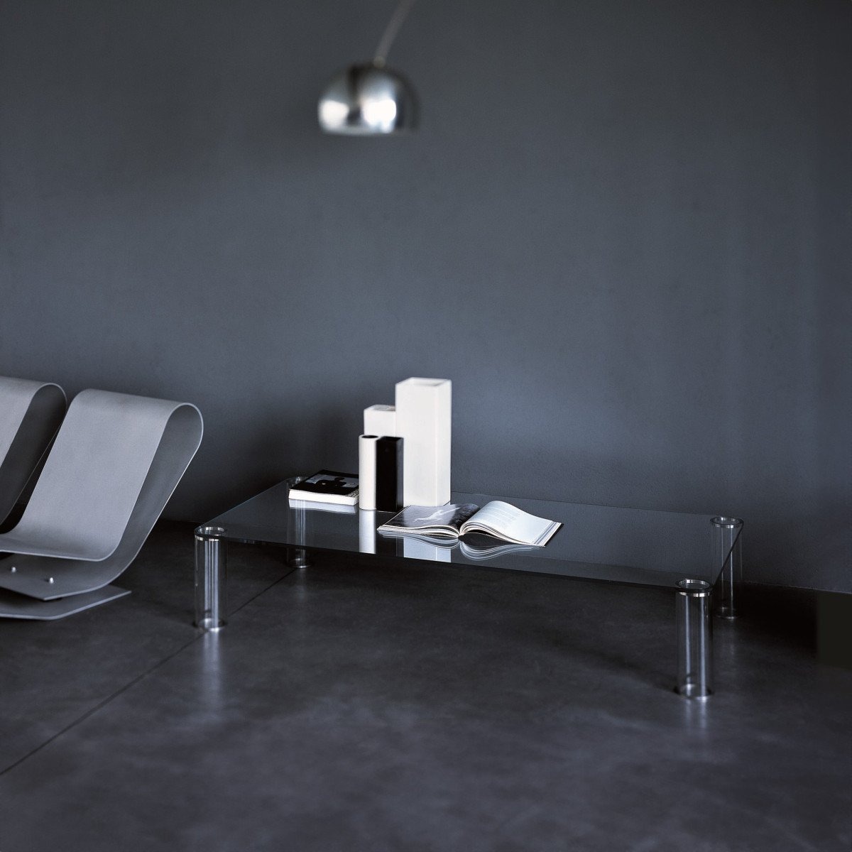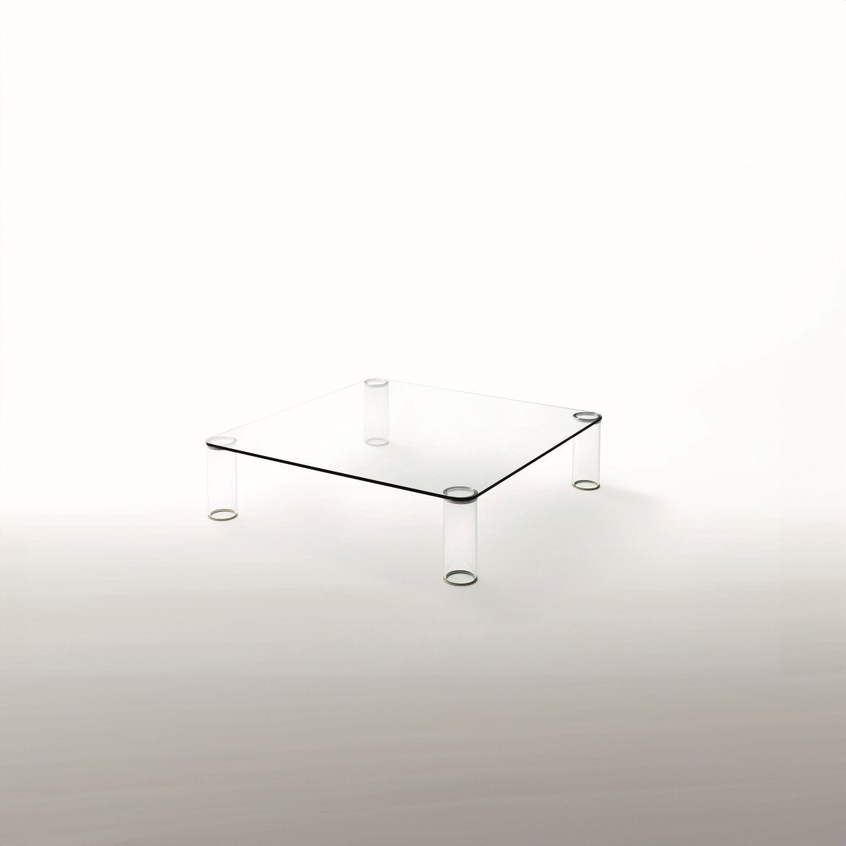 Серия низких столиков прямоугольной, квадратной и круглой формы. Столешница из закаленного стекла толщиной 12 мм доступна в прозрачном сверхлегком и глянцевом лакированном исполнении. Цилиндрические ножки выполнены из прозрачного боросиликатного стекла.
