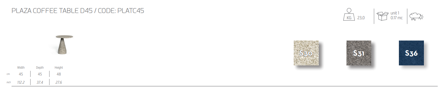 Журнальный столик d45 отличается элегантным и современным дизайном, для которого характерно устойчивое коническое основание, поддерживающее круглую столешницу. Выполненный с изысканной отделкой, этот столик идеально подходит для придания элегантности наружным или внутренним помещениям. Его прочная конструкция и большая поверхность делают его идеальным предметом мебели для сидений и диванов, предлагая практичную и в то же время привлекательную поверхность.