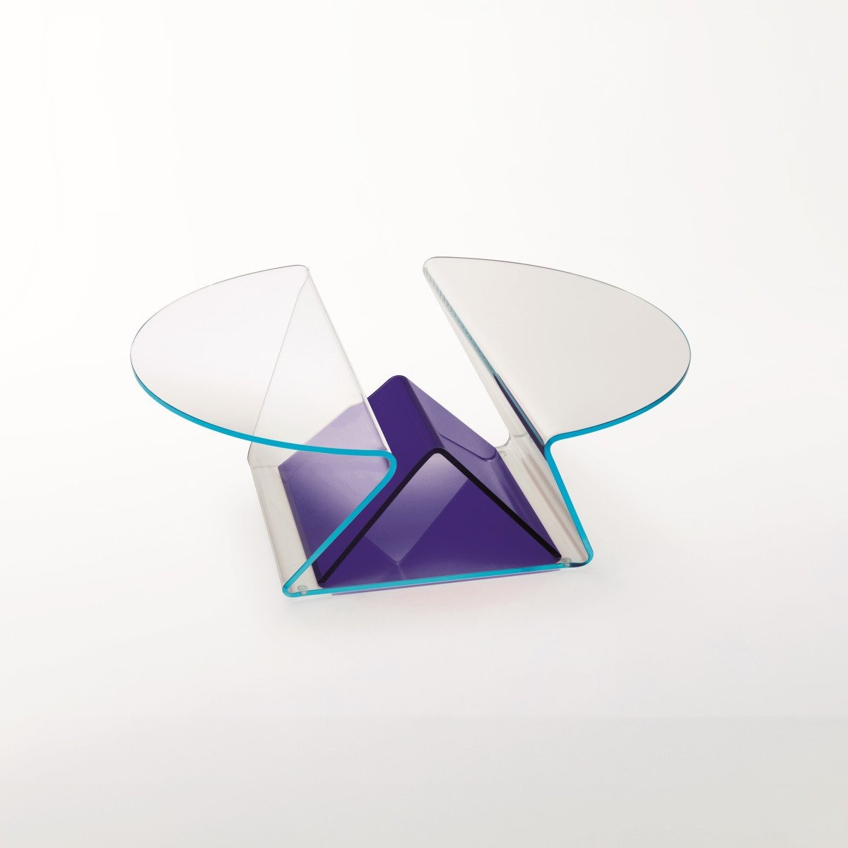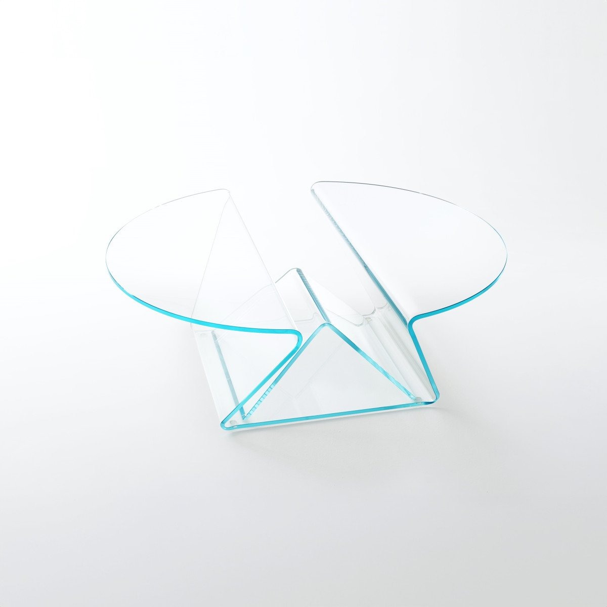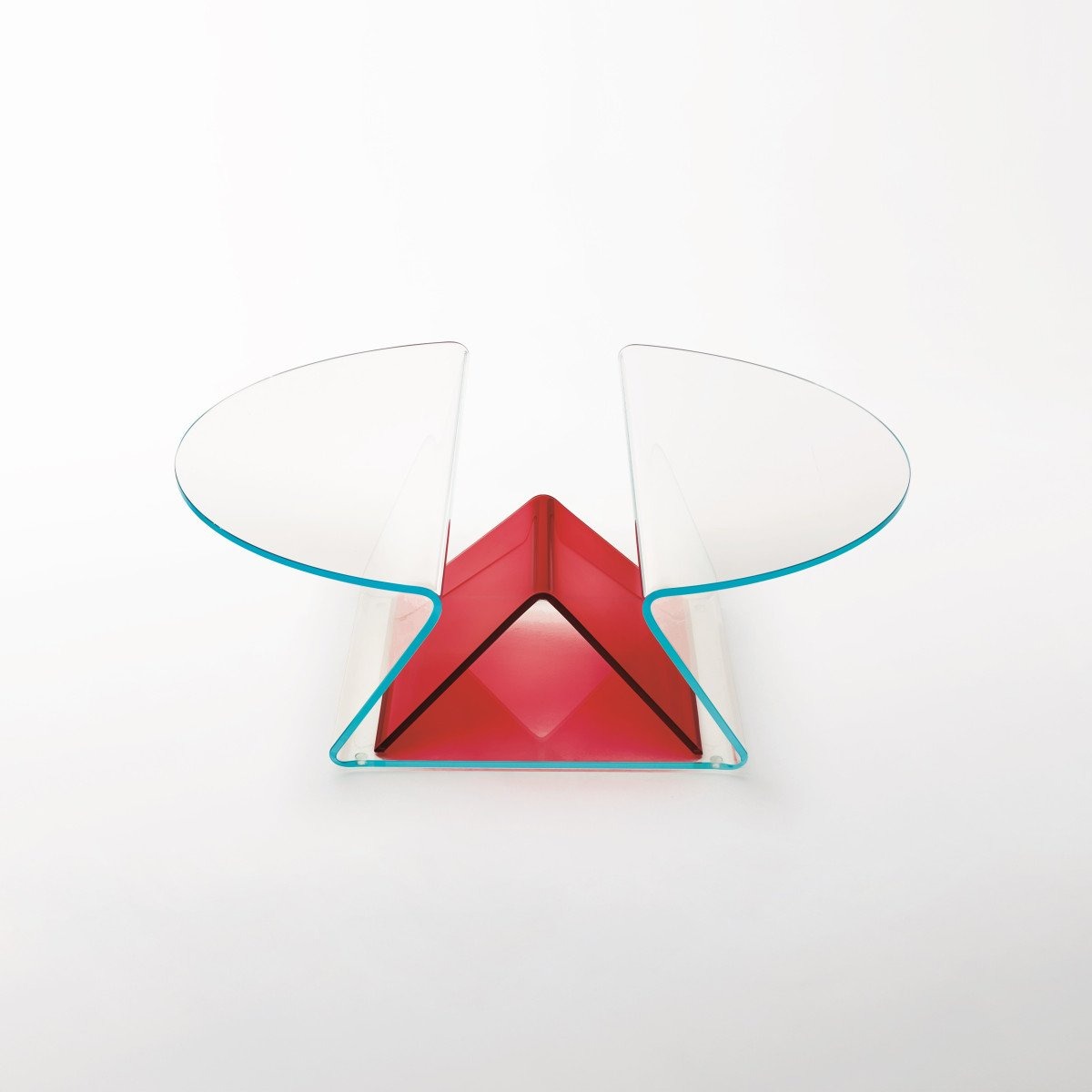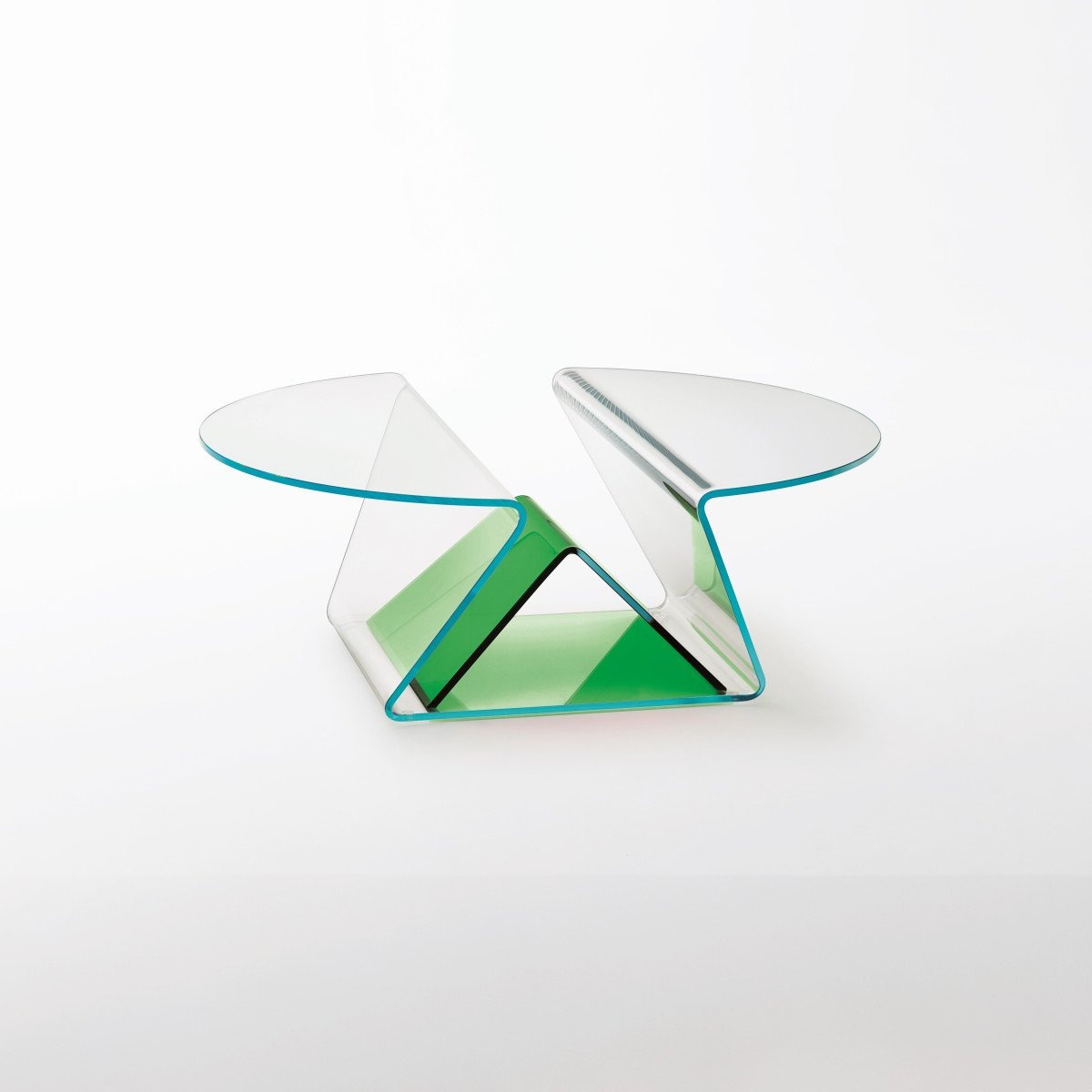 Чрезвычайно функциональный низкий столик с легким фасоном и мягкими и изящными формами из сверхлегкого стекла толщиной 12 мм, сформированный и изогнутый благодаря сложному процессу гибки стекла, с двумя консольными столешницами, разделенными практичным отделением для хранения предметов. В центре расположен функциональный стеллаж для журналов, выполненный из изогнутого стекла обратной V-образной формы, доступный в прозрачных цветах рубиново-красный, синий, изумрудно-зеленый или прозрачный экстралайт.