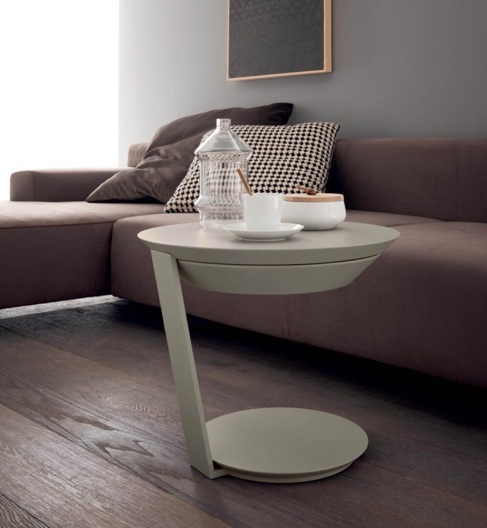 Дизайнерский журнальный столик с крашеным металлическим основанием. Круглая столешница, скошенная снизу, покрыта матовым или глянцевым лаком.