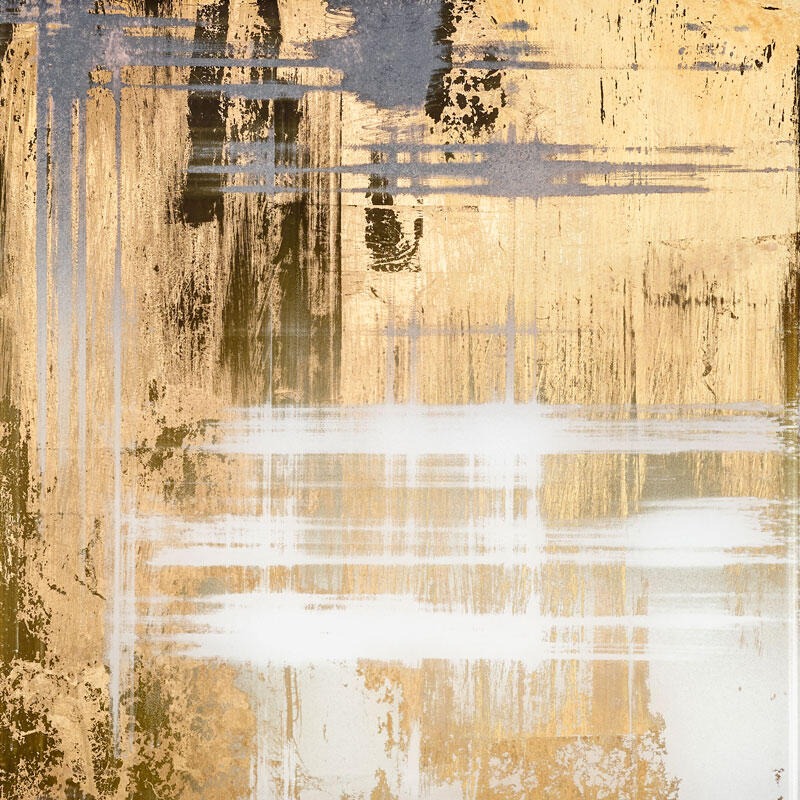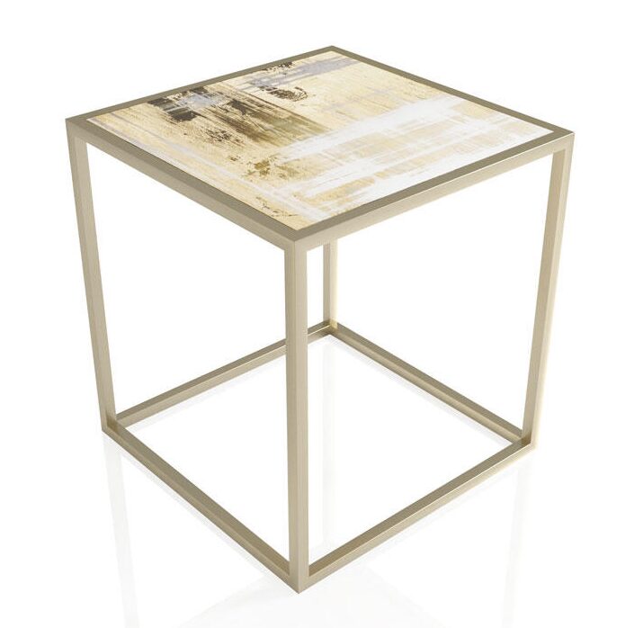 Металлическая конструкция в форме трубки с золотистой матовой отделкой. Столешница квадратной формы из декорированного стекла с зеркальным покрытием под старину.