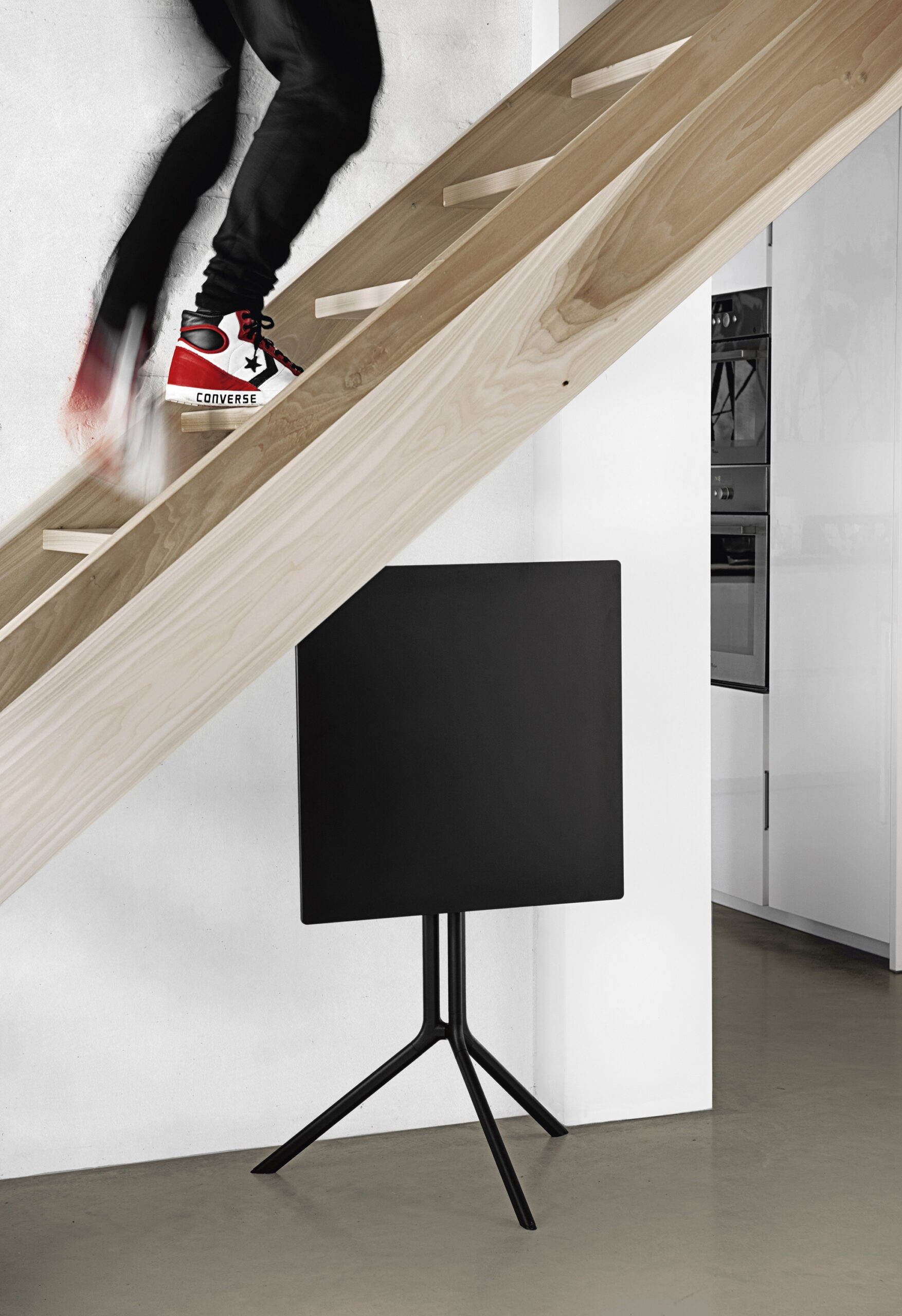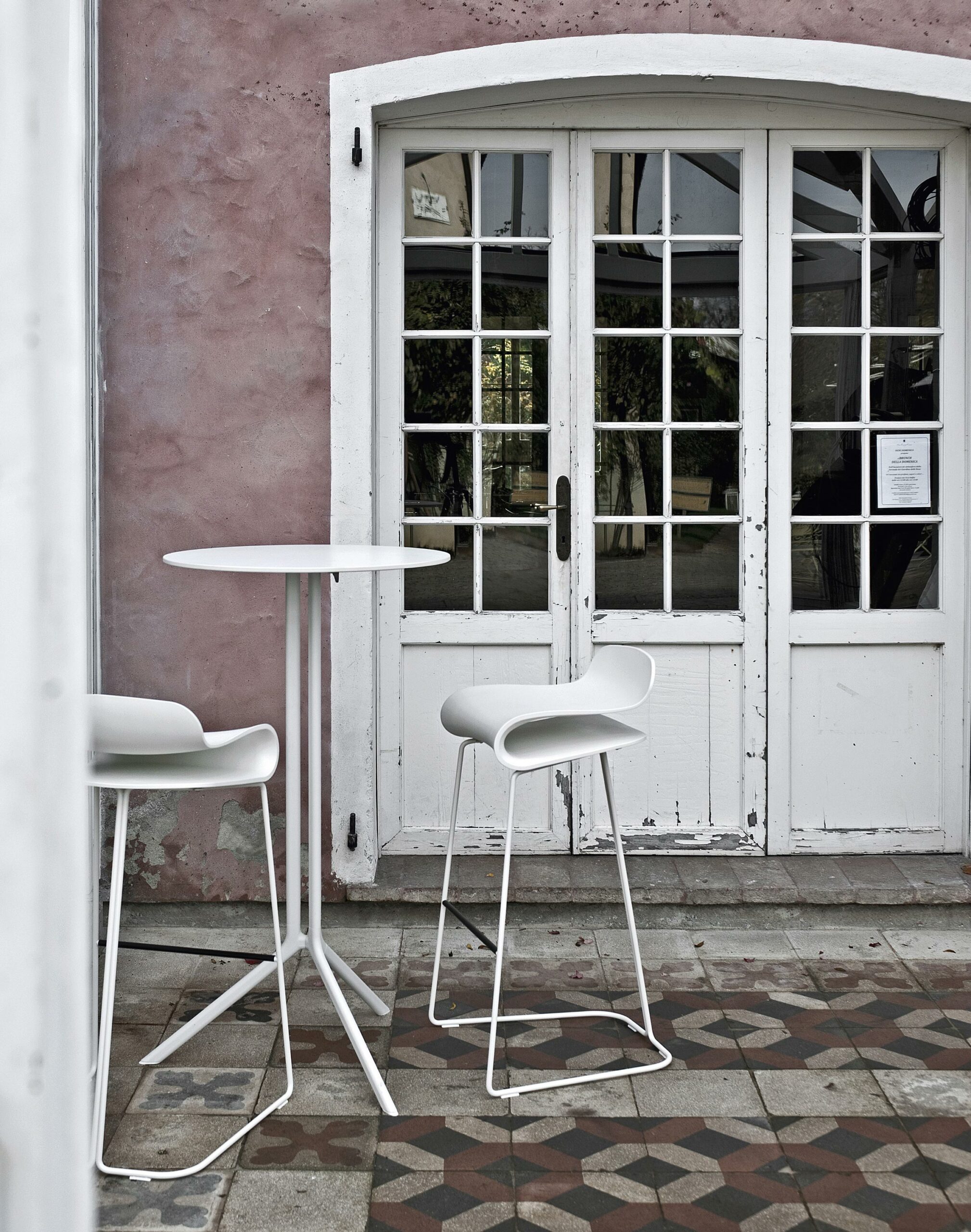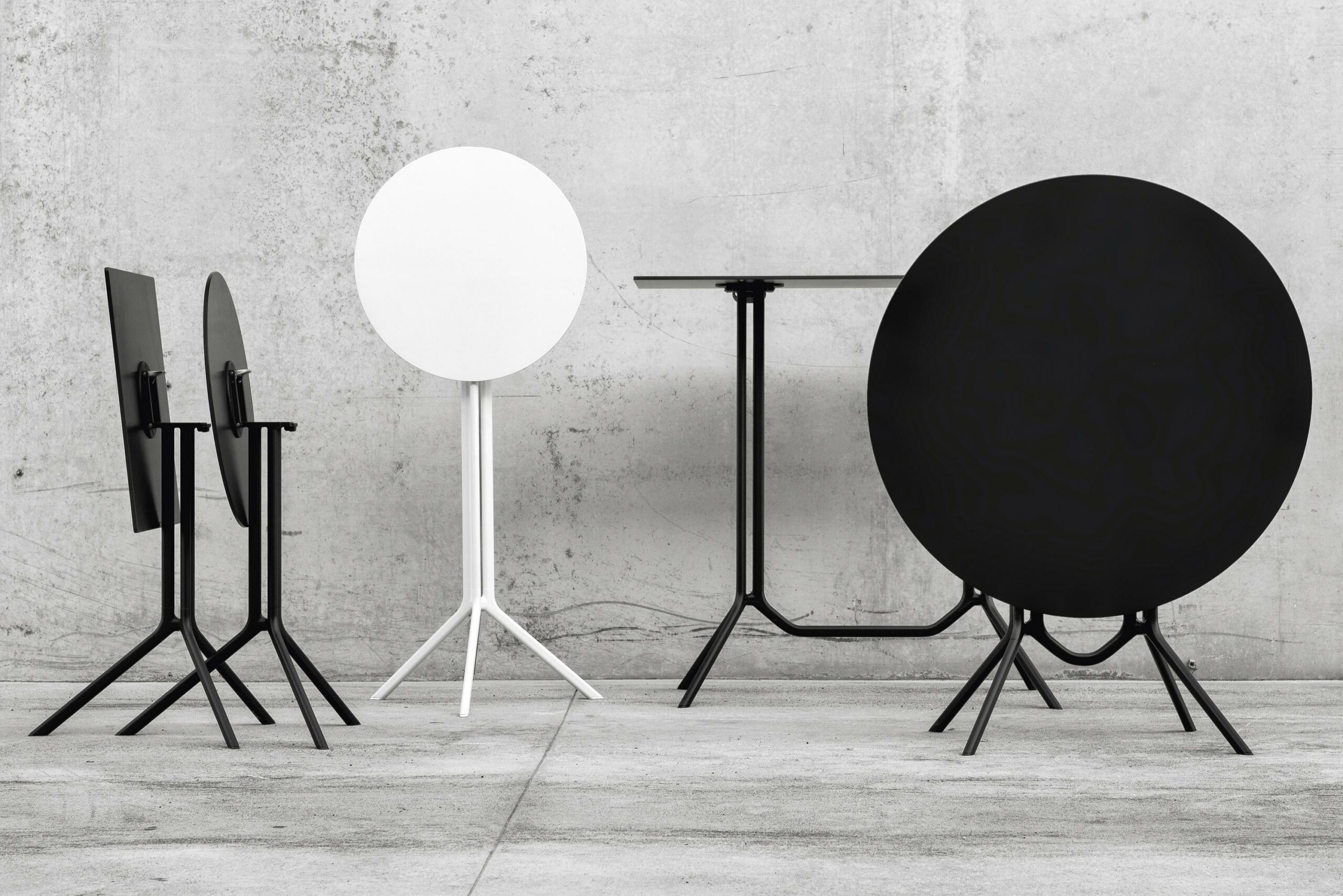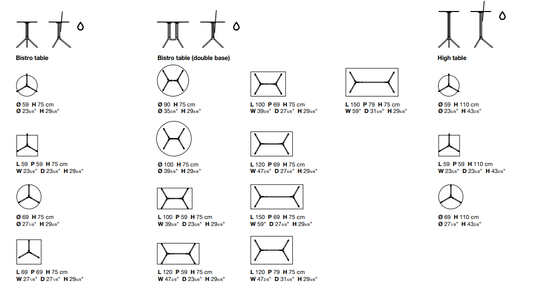 Доступен в нескольких вариантах: с круглой, квадратной или прямоугольной столешницей из ламината или инновационного материала Fenix-NTM®. Алюминиевая подставка представлена в черном или белом исполнении.