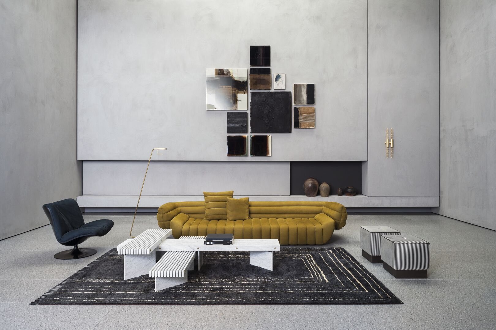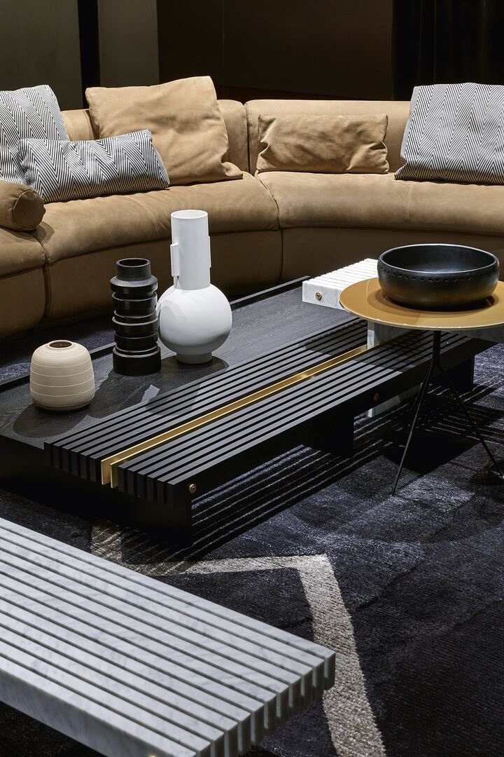 Низкие столики из коллекции Rail авторства Федерико Пери олицетворяют гармоничную встречу естественной красоты материалов и утонченности элегантного и лаконичного дизайна, характерного для Пери. Идеальный вариант для гостиной, кабинета и любого жилого помещения: каждый столик оснащен столешницей, образованной из каменных или деревянных планок, виртуозно соединенных друг с другом при помощи стержней из сатинированной латуни. Ножки, доступные в исполнении из камня или дерева, крепятся к столешнице на соединения из сатинированной латуни, придавая устойчивость и определенную изысканность. Такая конструкция порождает грациозную игру фактурных линий, что подчеркивает модульность поверхности и ручной труд, который таится во всех деталях. Вместе с тем каждый отдельный столик представляет оригинальный узор прожилок и естественные несовершенства, характерные для мрамора, выступая как ода во славу сырья, которое акцентирует аутентичность мира природы.