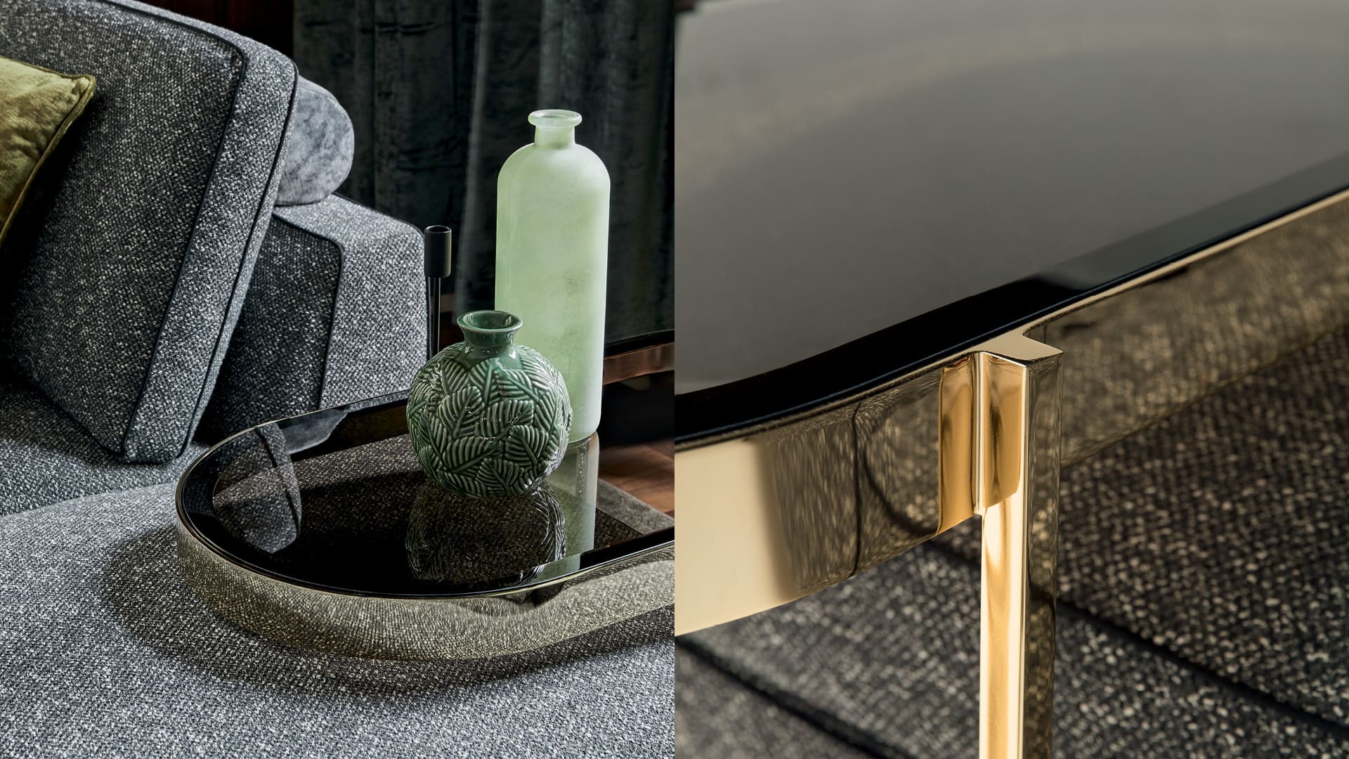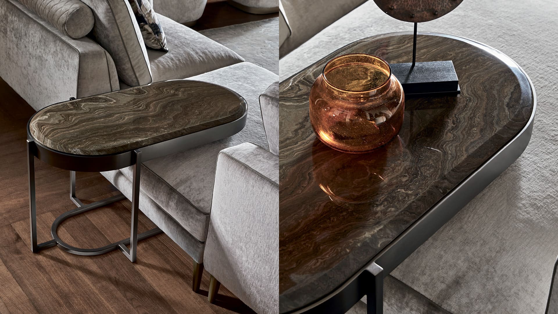 Металлический сервировочный столик Raoul имеет строгий дизайн со скошенной столешницей из мрамора или стекла, встроенной в раму. Его дизайн специально разработан для установки поверх диванных сидений и отличается практичностью и функциональностью.