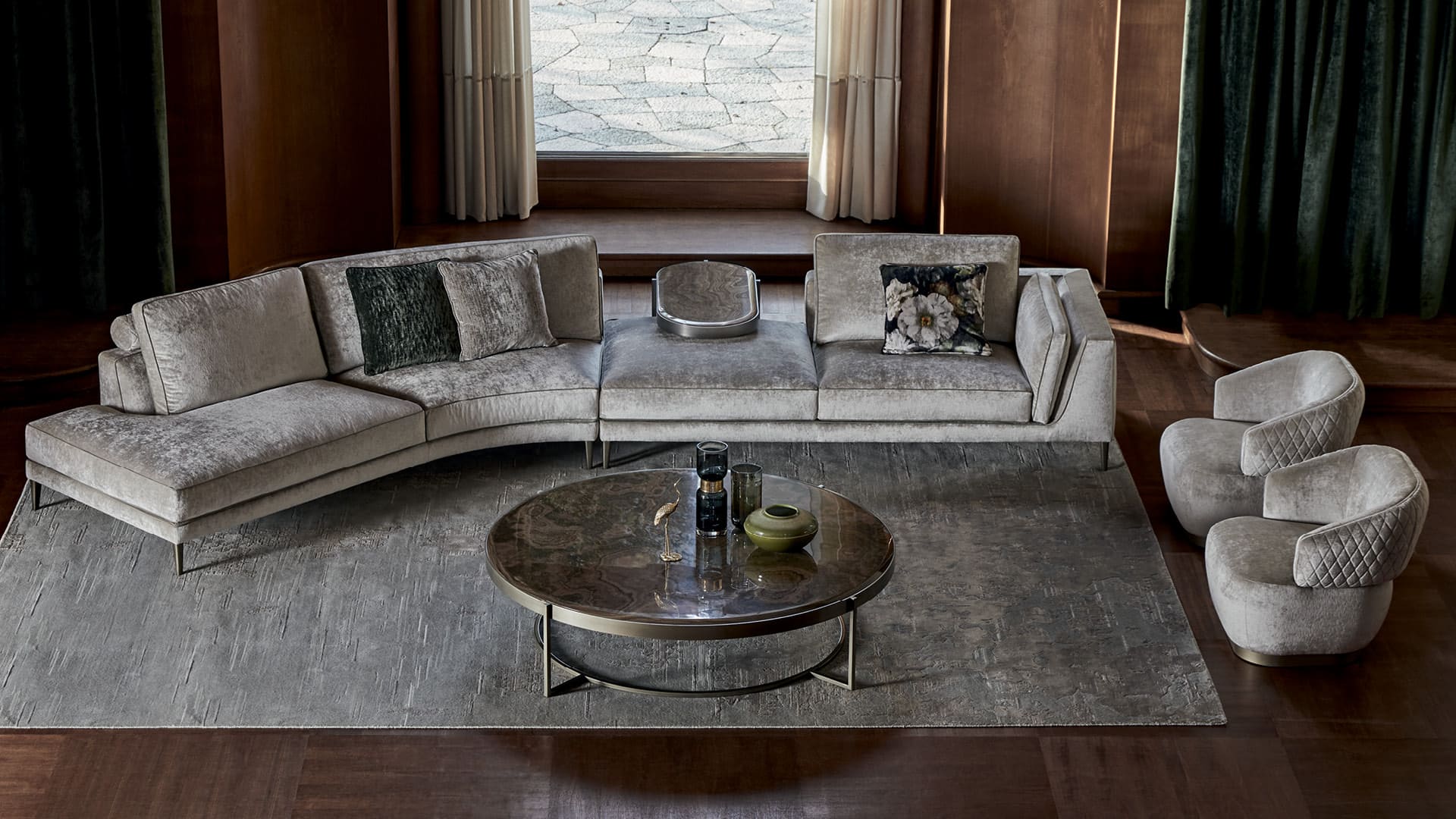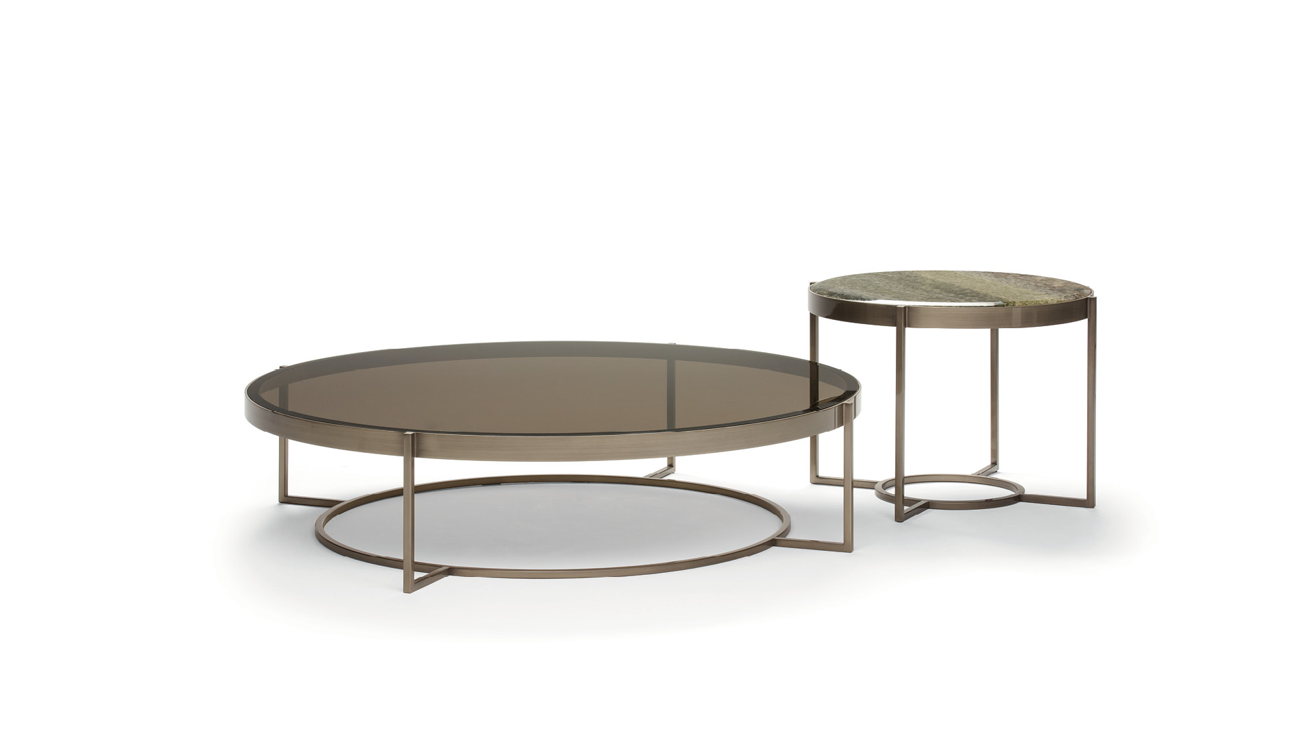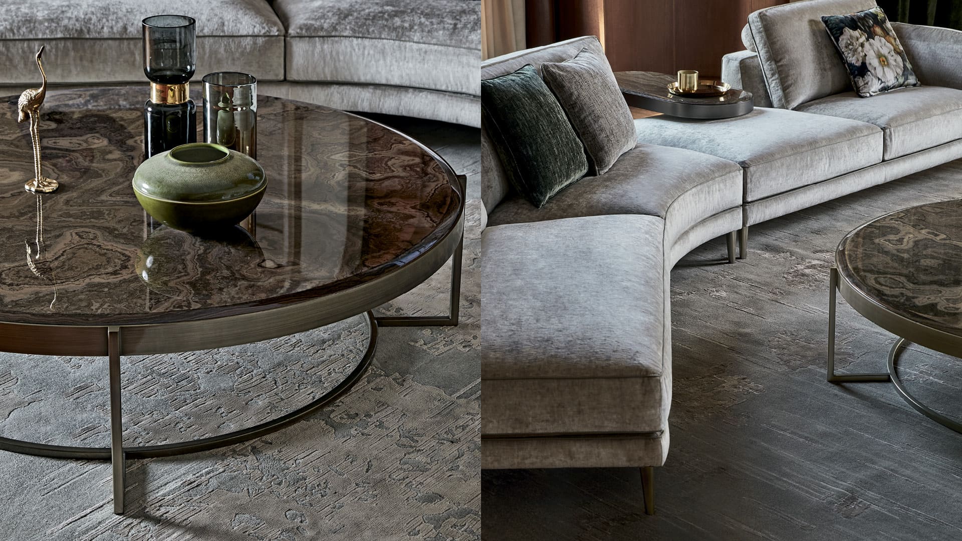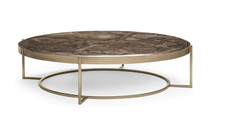 Круглый металлический журнальный столик Raoul в центре имеет строгий дизайн со скошенной столешницей из мрамора или стекла, встроенной в раму. Благодаря своим размерам он подходит для больших жилых помещений.