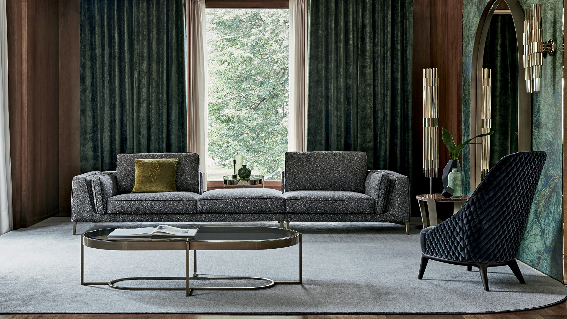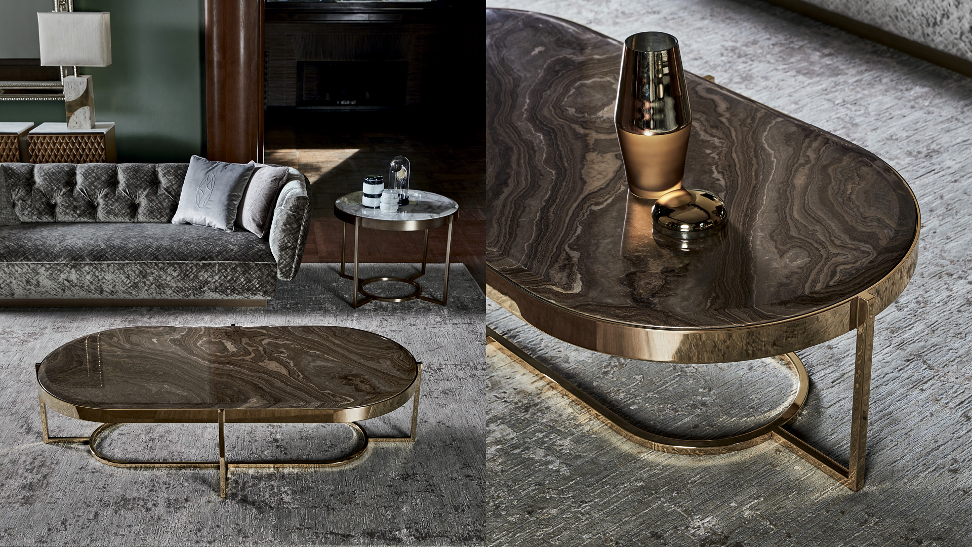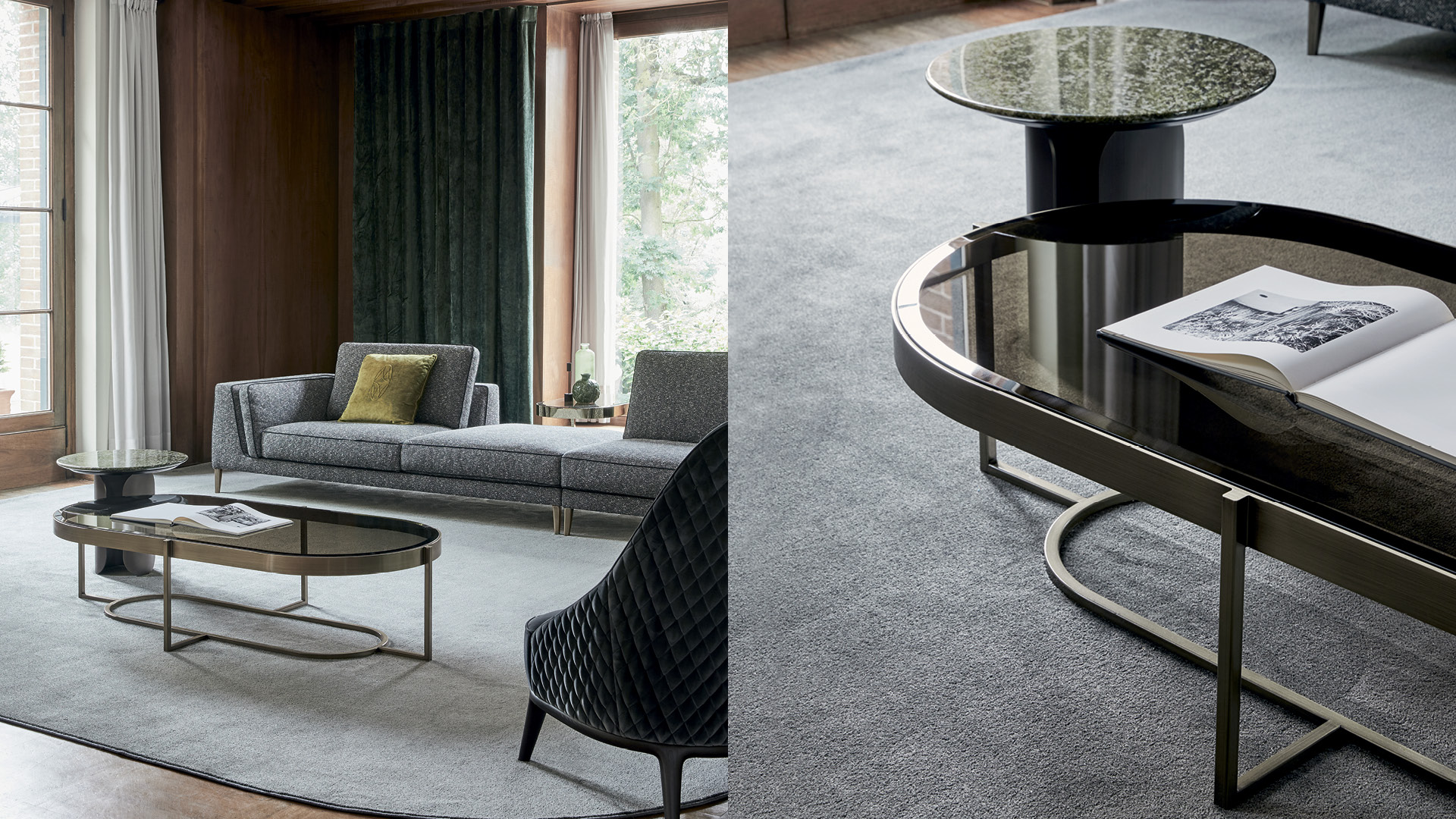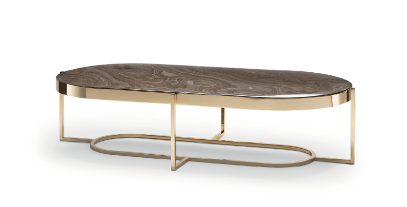 Центральный металлический журнальный столик Raoul имеет строгий дизайн со скошенной столешницей из мрамора или стекла, встроенной в раму. Благодаря своим размерам он подходит для больших жилых помещений.