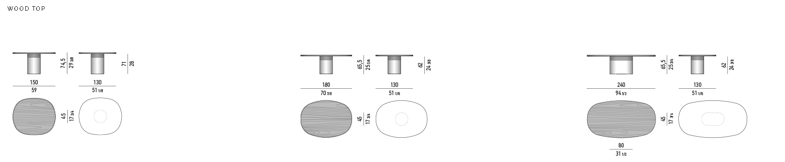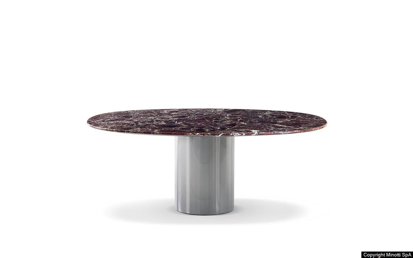 Предмет мебели, который легко занимает центральное место благодаря цилиндрическому основанию из зеркальной нержавеющей стали или черного кофейного металла, на которое опирается округлая эллиптическая столешница из мрамора или дерева.