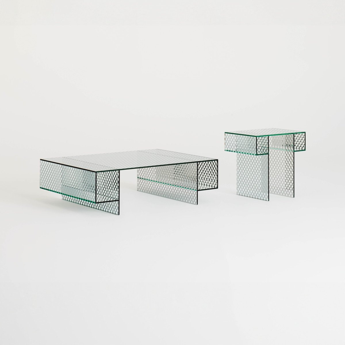 Коллекция низких столиков, консолей и мебели для хранения, полностью изготовленных из специального двустороннего зеркального стекла, с декоративным рисунком в виде круглых прозрачных меток, имитирующих перфорированный металлический лист. Все стекло закалено и скреплено УФ-излучением. Обе двери открываются и закрываются с помощью двухтактной системы.