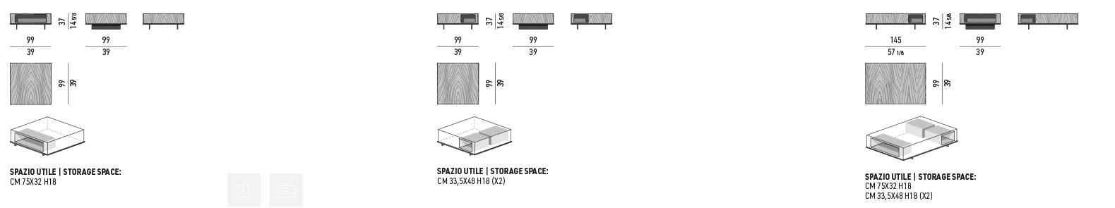 В ассортименте представлены три журнальных столика в форме изящной шкатулки строго геометрического объема. В этих отделениях для хранения вещей имеется алюминиевая облицовка с матовым лакированным покрытием коньячного цвета.
