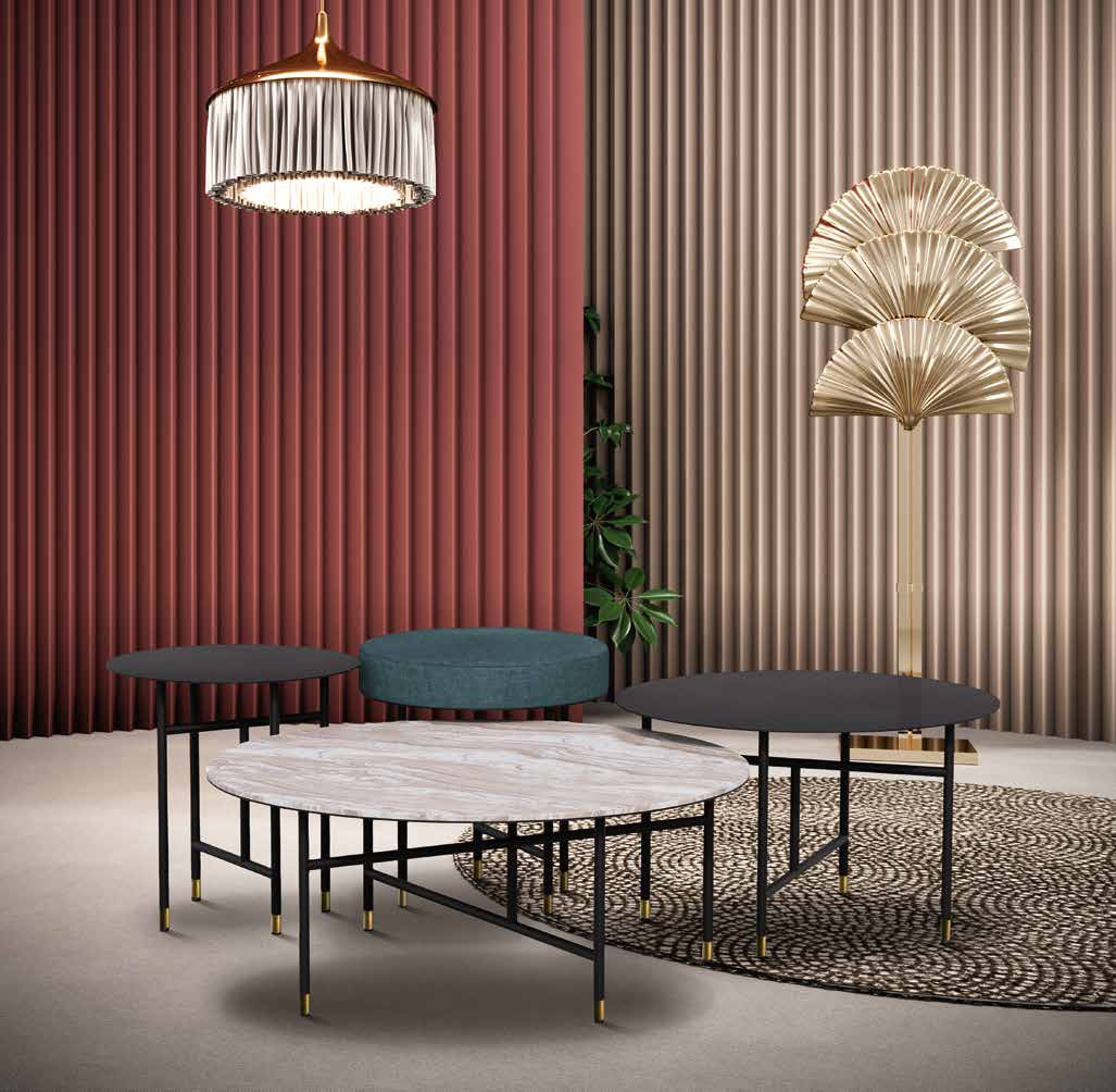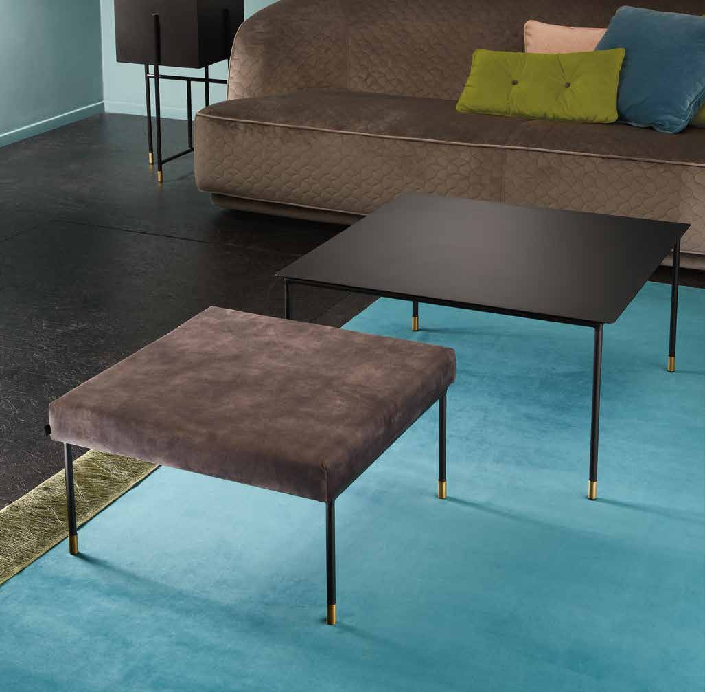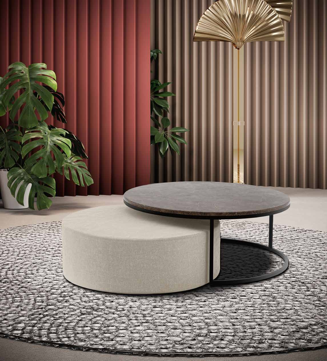Особенности: пуф и журнальный столик с черным металлическим каркасом и мраморным верхом в emperador brown.