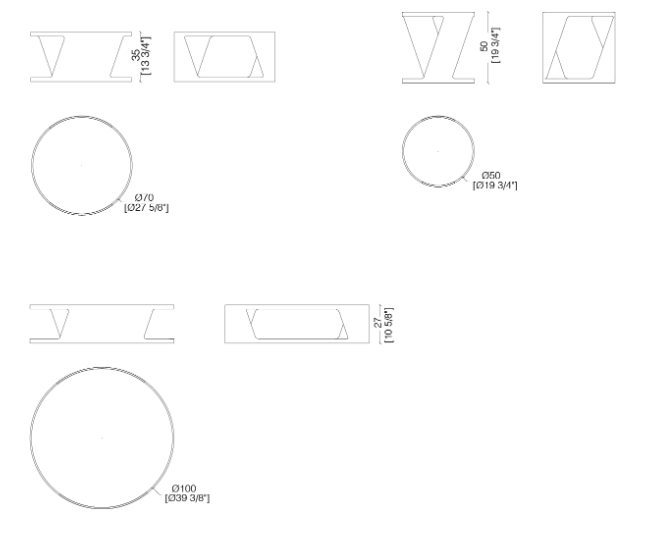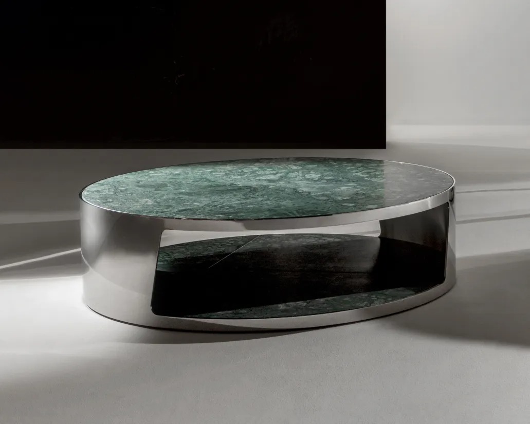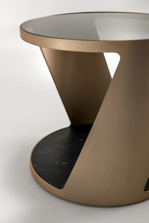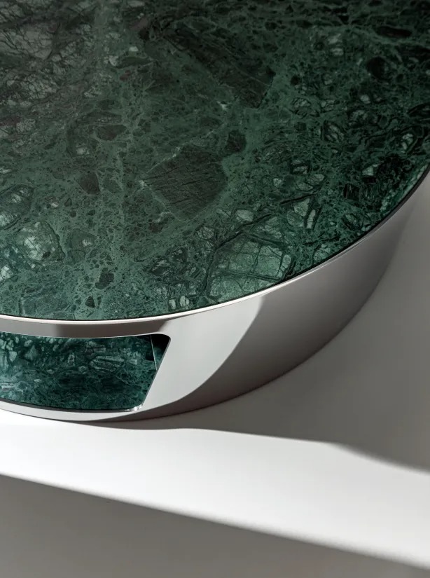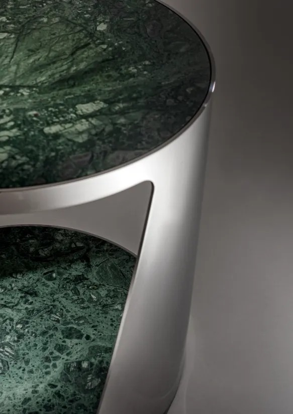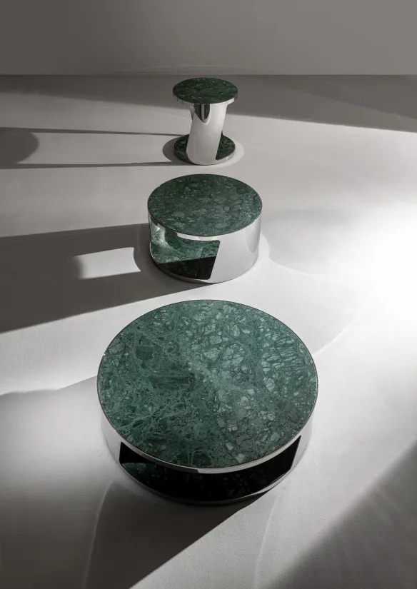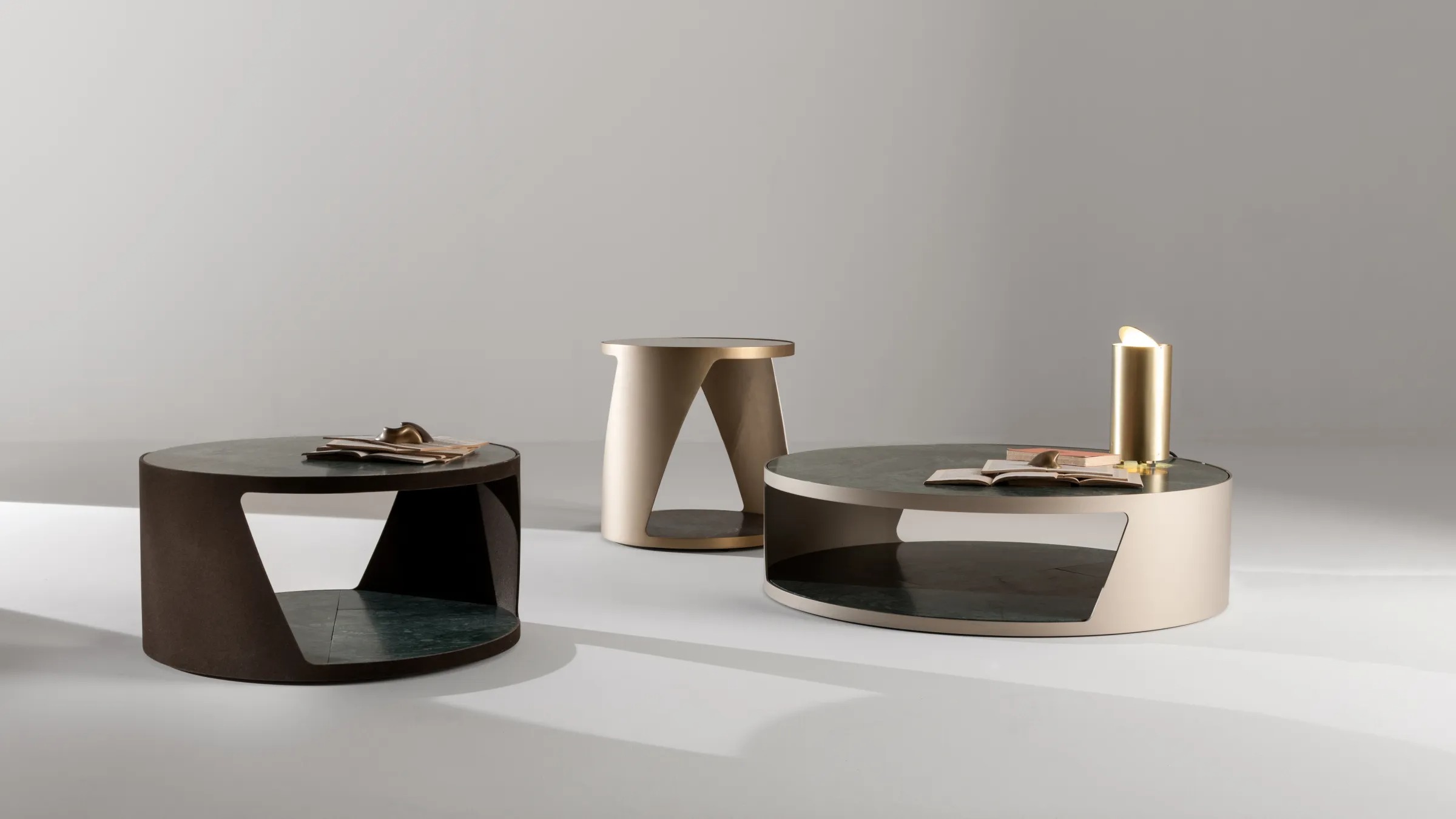 Семейство кофейных столов, доступных в трех размерах и дизайнах, с круглой структурой из лакированного металла и персонализированными наклонными столешницами в отделках.