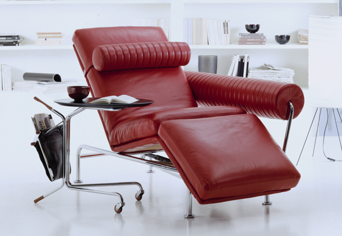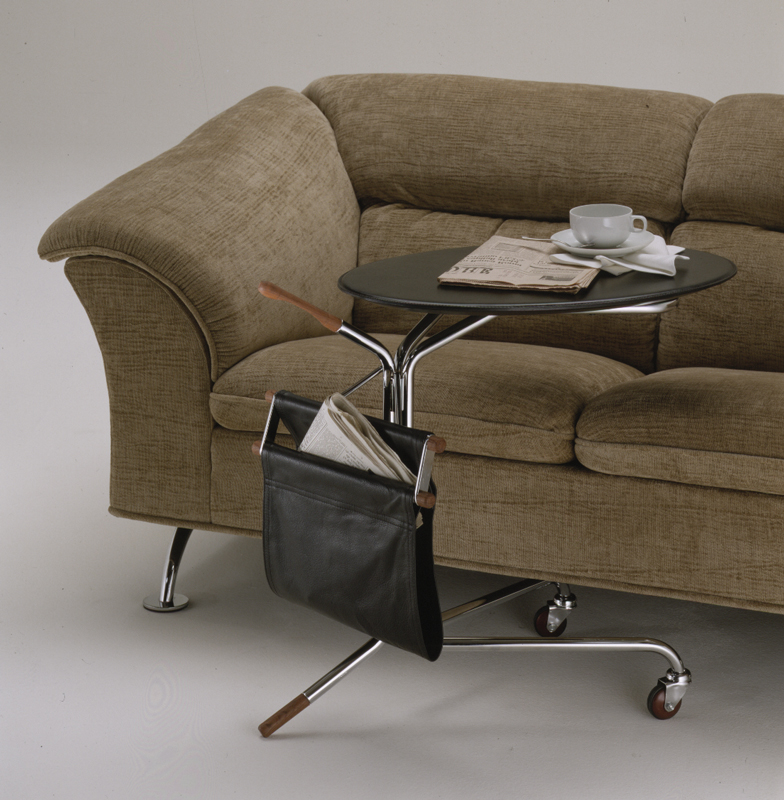 Журнальный столик со столешницей из МДФ, обтянутой натуральной кожей. Кожаный карман для хранения вещей. Основание из хромированной трубчатой стали с деталями из массива дерева бубинга.
