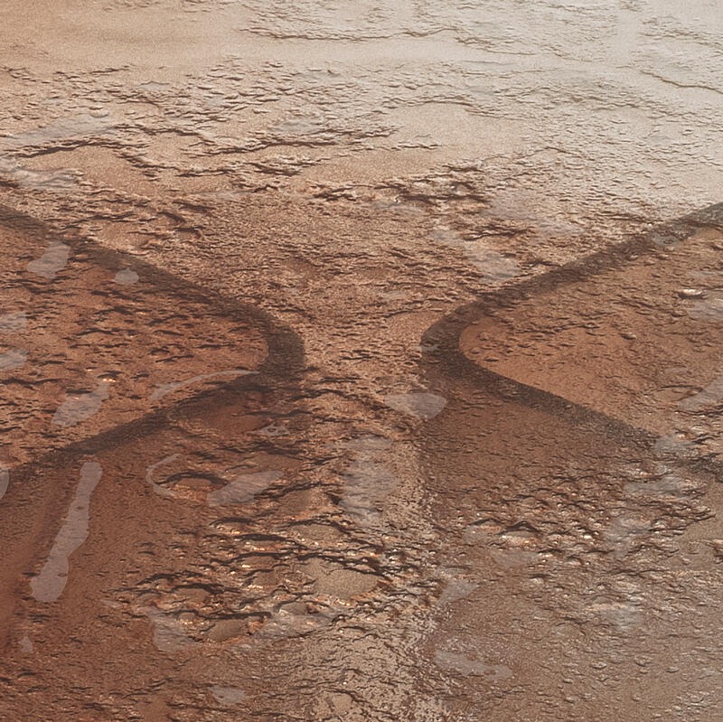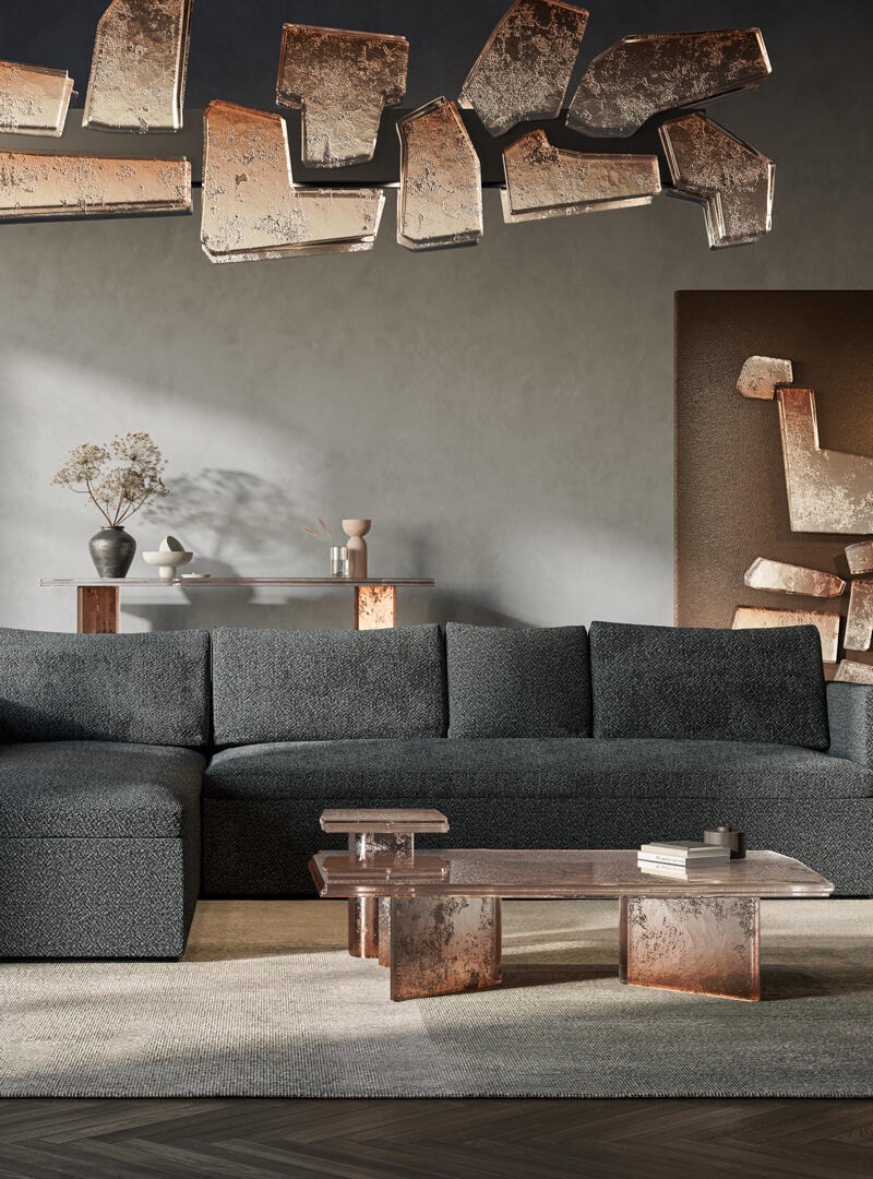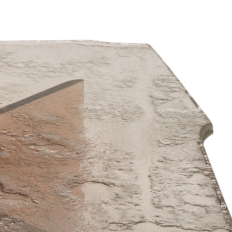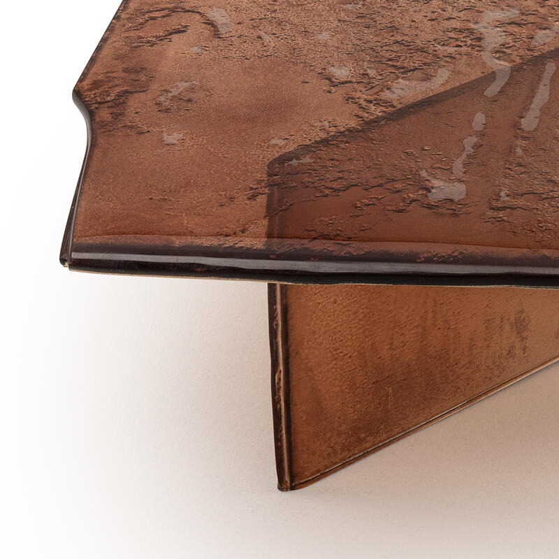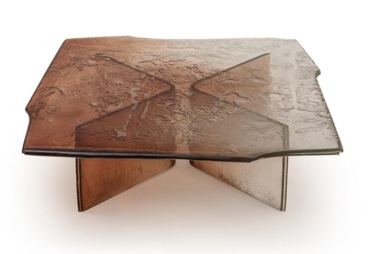 Столешница и ножки из обожженного стекла в два слоя с неровными краями.