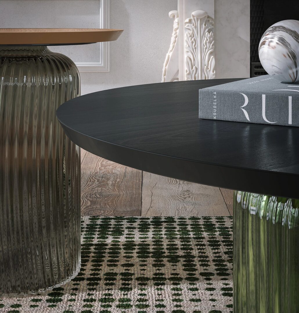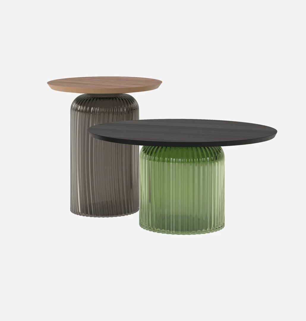 Журнальные столики из художественного стекла venezia не выдуваются ртом, с эффектом складок на поверхности; обогащенные элегантными круглыми вершинами с наклонным краем, покрытыми матовым ясенем.