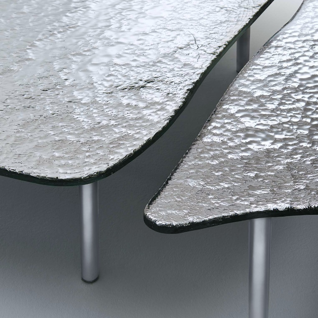 Коллекция высоких столов-консолей и столиков, закругленными краями и элегантными тонкими ножками из выдувного стекла. Различные элементы, доступные независимо друг от друга, при близком расположении друг к другу, могут создать стол больших размеров. Столешницы выполнены из специального литого посеребренного стекла. Ножки всегда имеют одинаковую отделку верха.