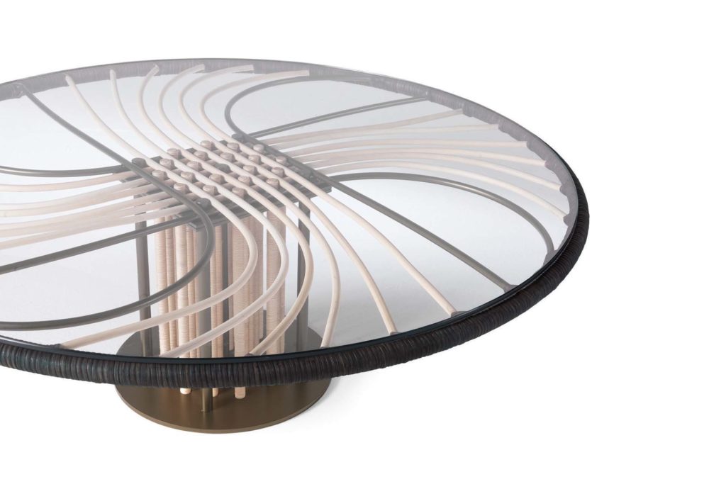 Оригинальный центральный журнальный столик с бронзовым металлическим каркасом, натуральным тонированным медоллином и тонированным углеродом, стеклянная столешница, предназначенная для удовлетворения потребности в опорном элементе, внутри или вне дома. Центральный журнальный столик SUNRISE в сочетании с одноименными стульями и креслами может подчеркнуть гармонию живого уголка вашего dehor и жить в качестве главного героя мебели.