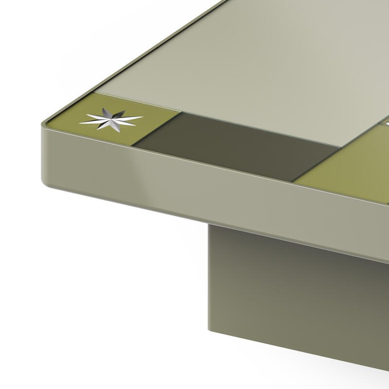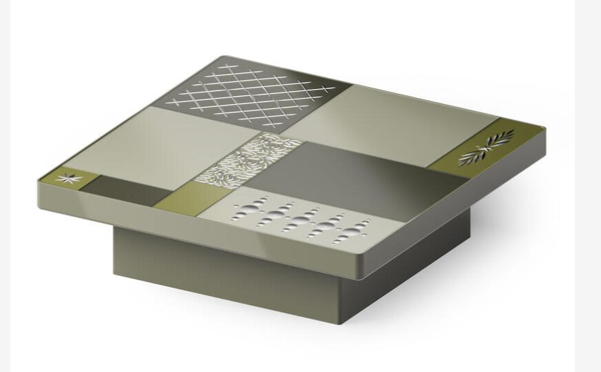 Каркас из фанеры, покрытой лаком цвета каки. Столешница покрыта особо прозрачным стеклом толщиной 6 мм с кислотным травлением, покрытым разноцветным лаком и украшенным серебряной ручной гравировкой.
