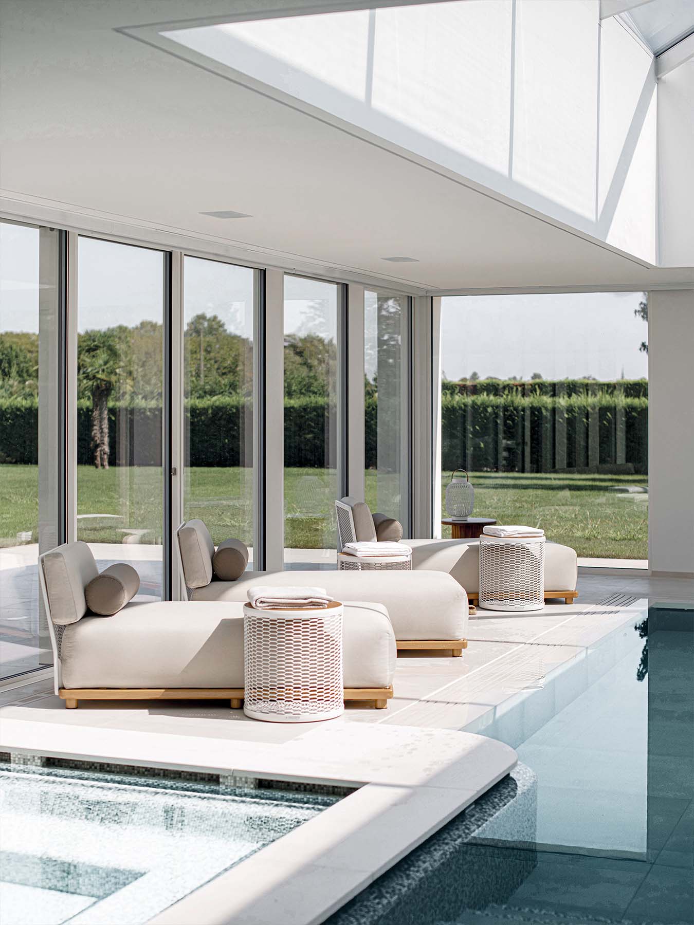 Главными героями этой коллекции являются модульные диваны, столы для прислуги, вписанные в окружающую